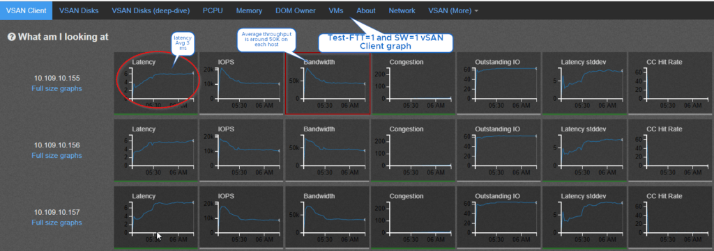 Test result on Storage Policy Definition as failures to tolerate -1 and stripe-width=1 gives with the workload definition “6 VMs, 8-vDisks, 80% working set , 4K Block Size, 70% read% and 80% random packets , number of threads as 4” is 31111 IOPS and throughput of 121MB/s .