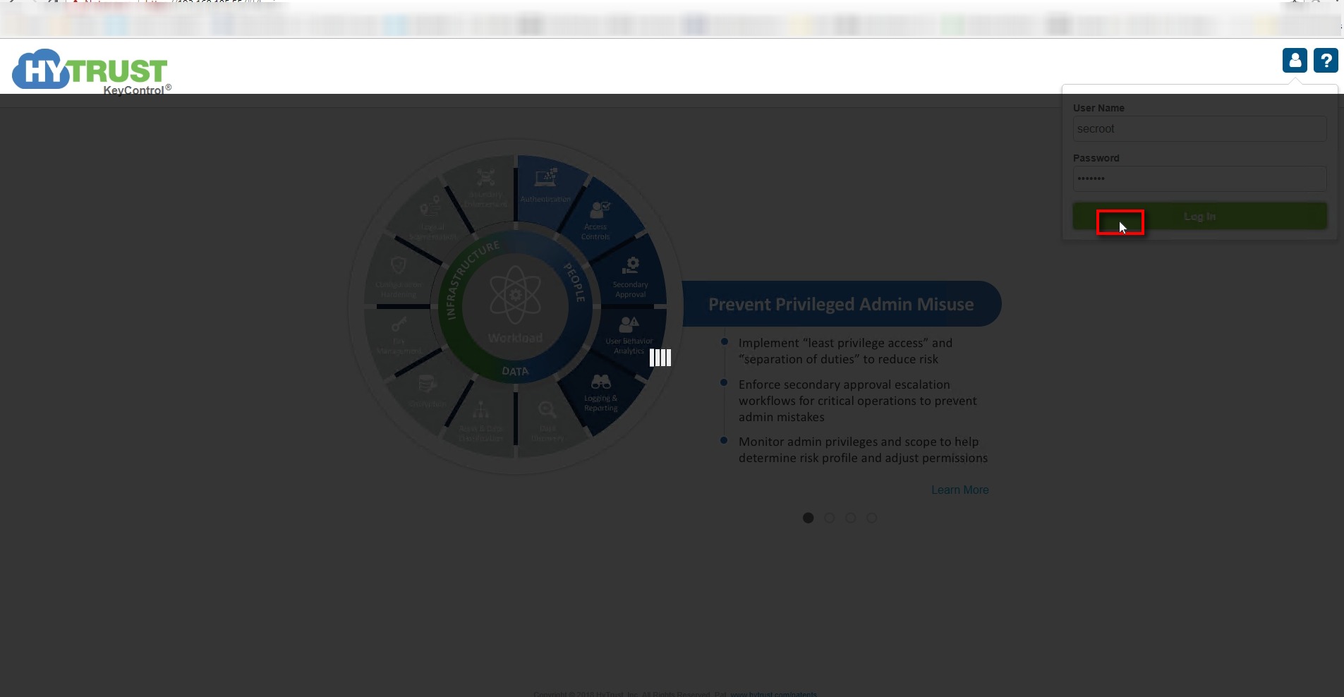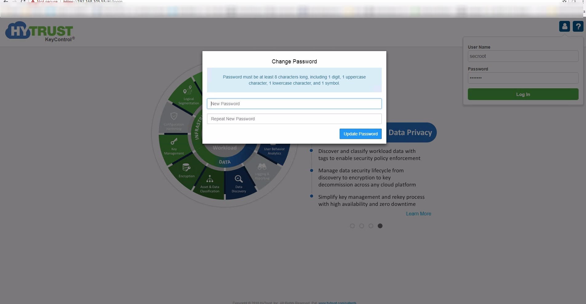 2. Head over to the webpage , then login with user/password as “secroot/secroot” . Remember this is not the same password which was setup on the console and will needs to be changed after first time login on the web page .