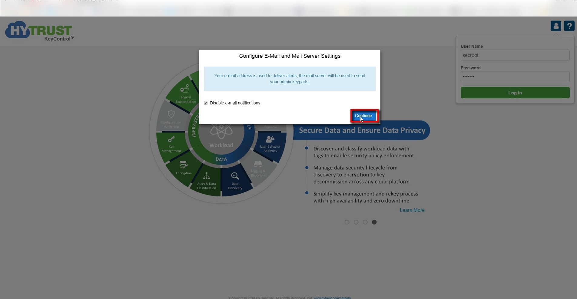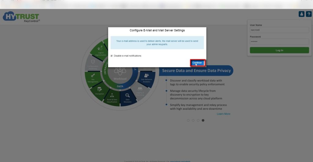 - You may choose to configure Email alerts to receive alerts from the KMS-appliance , I chose to skip this .