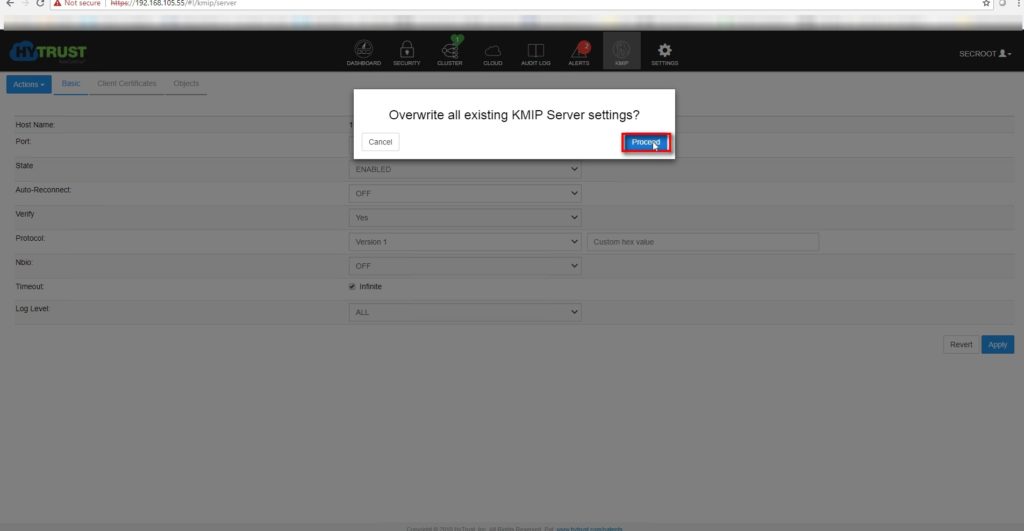 - Enable KMIP on the KMS server and hit proceed to continue with Overwrite if prompted as we are configuring this KMS cluster for the first time. Also make a note of the port number .