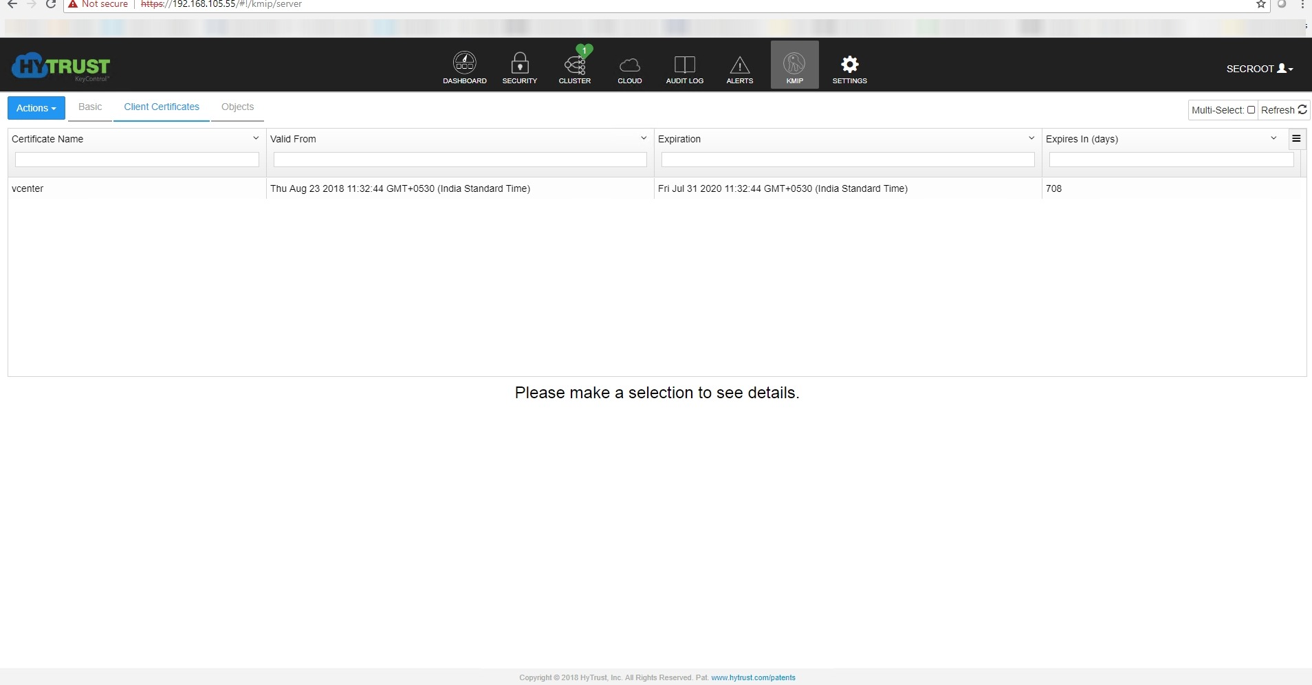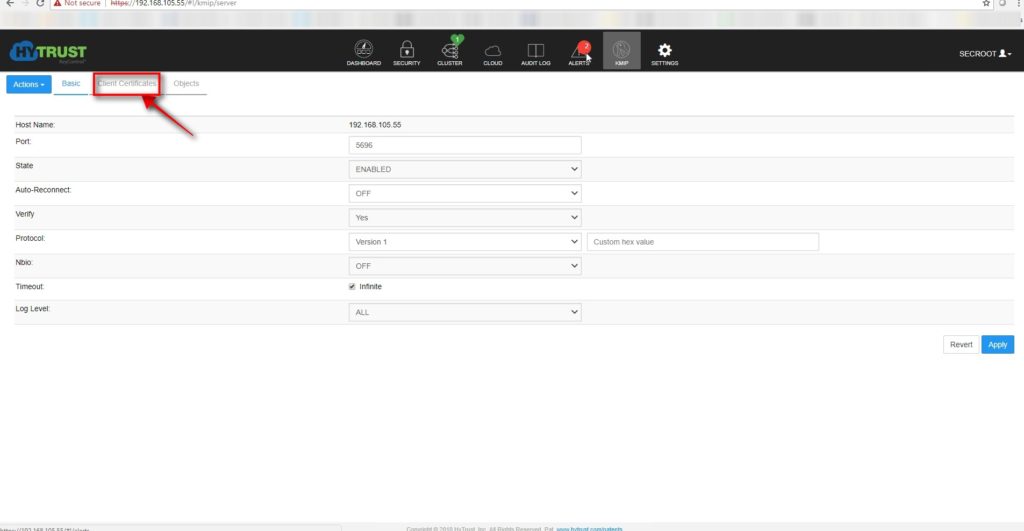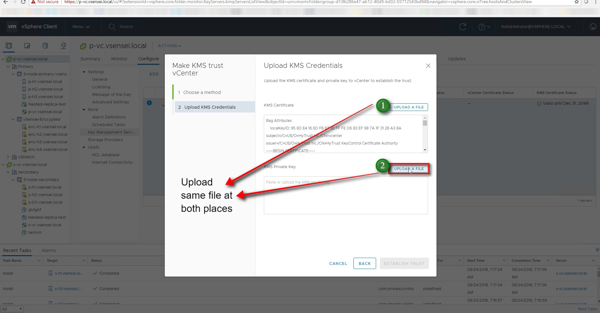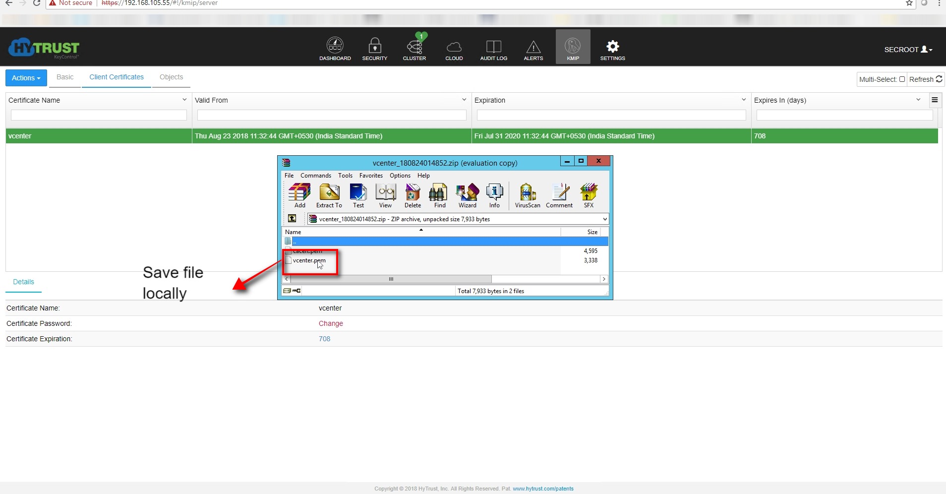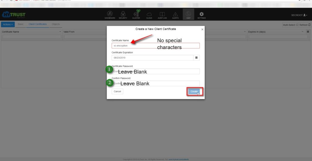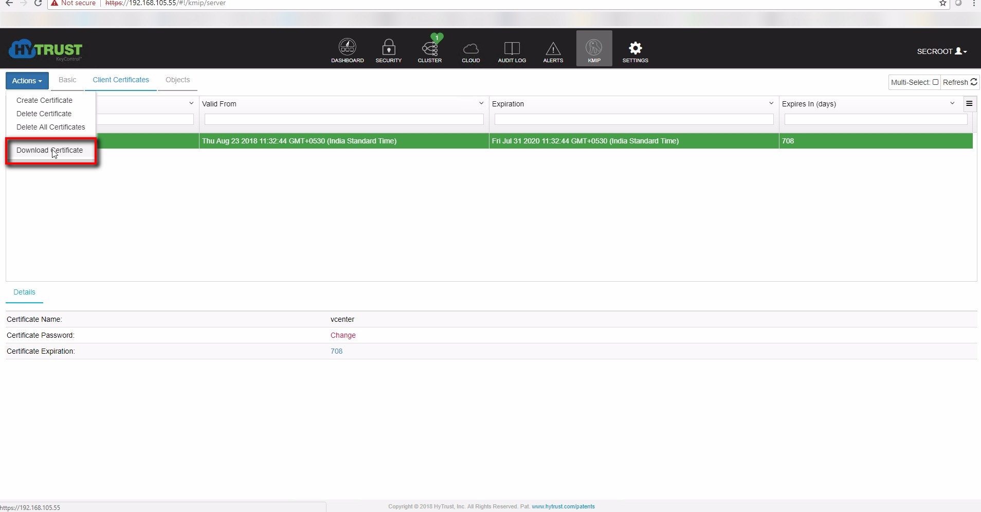 - Hytrust uses KMS certificate and private key upload method to the vcenter server for KMS to trust the vcenter server . Hence we will need to download the client certificate (KMS-certificate and private key) and upload it to the vcenter server .