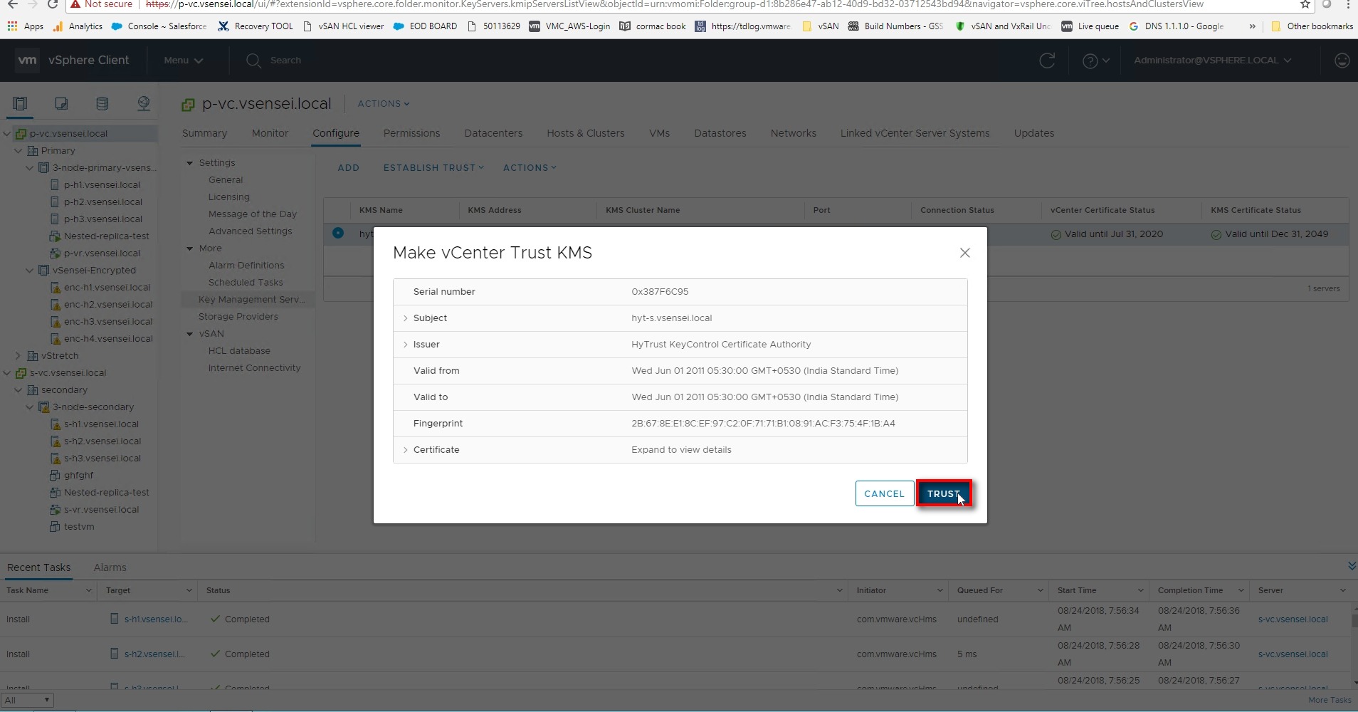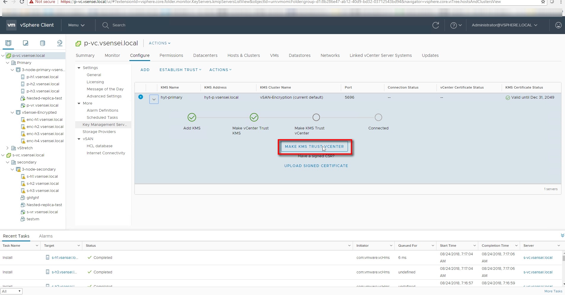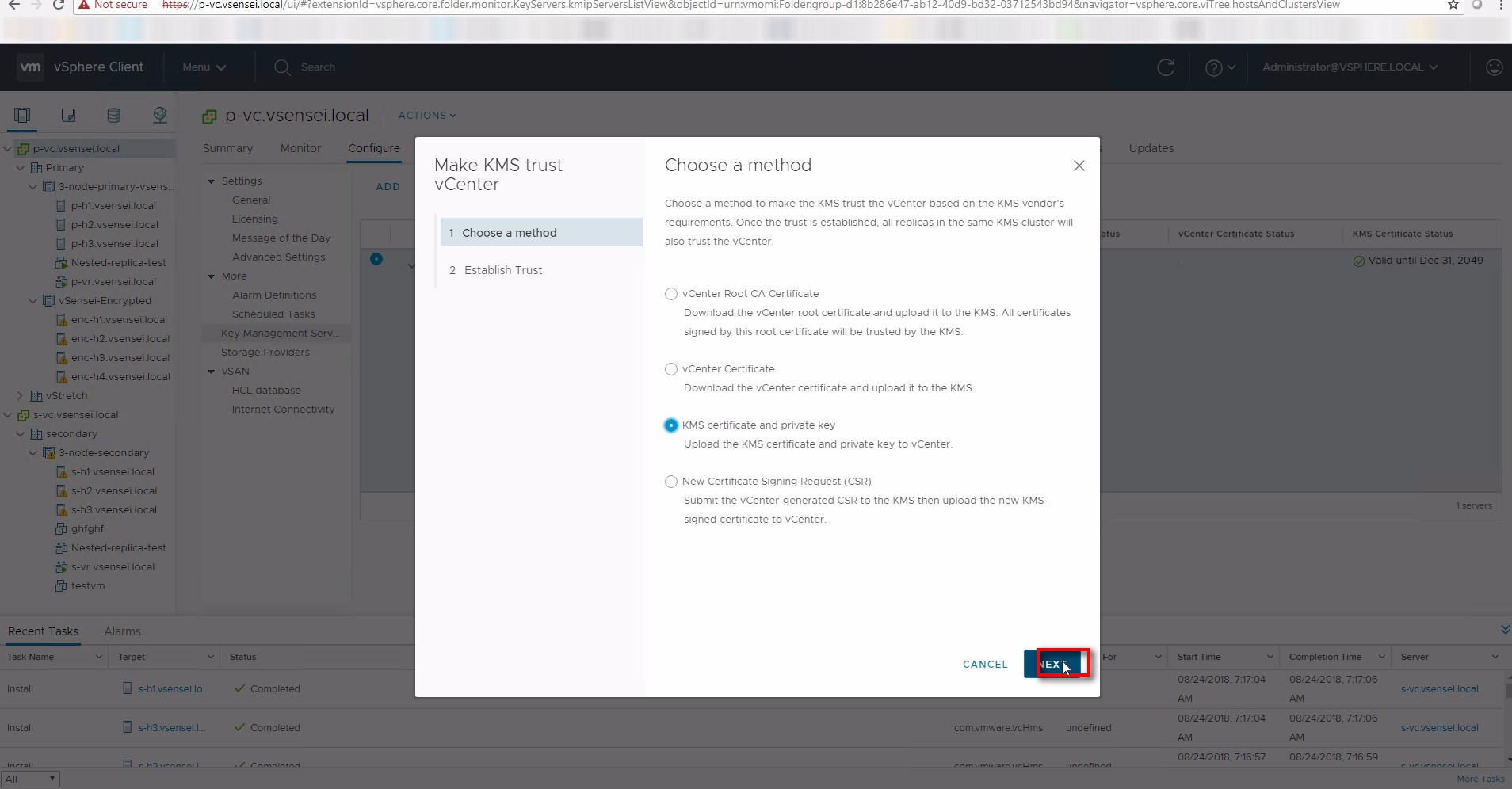 VC pushes KMS certificate to all the hosts part of vSAN cluster with KEKID