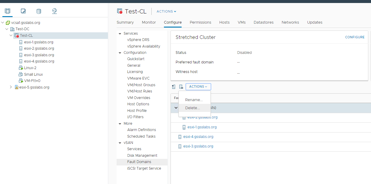 Here in this example I have got 4 node vSAN cluster running vSAN 6.7 with vCenter server running 6.7 U1 , the steps used should be the similar for all version of vSAN cluster which supports stretched cluster .