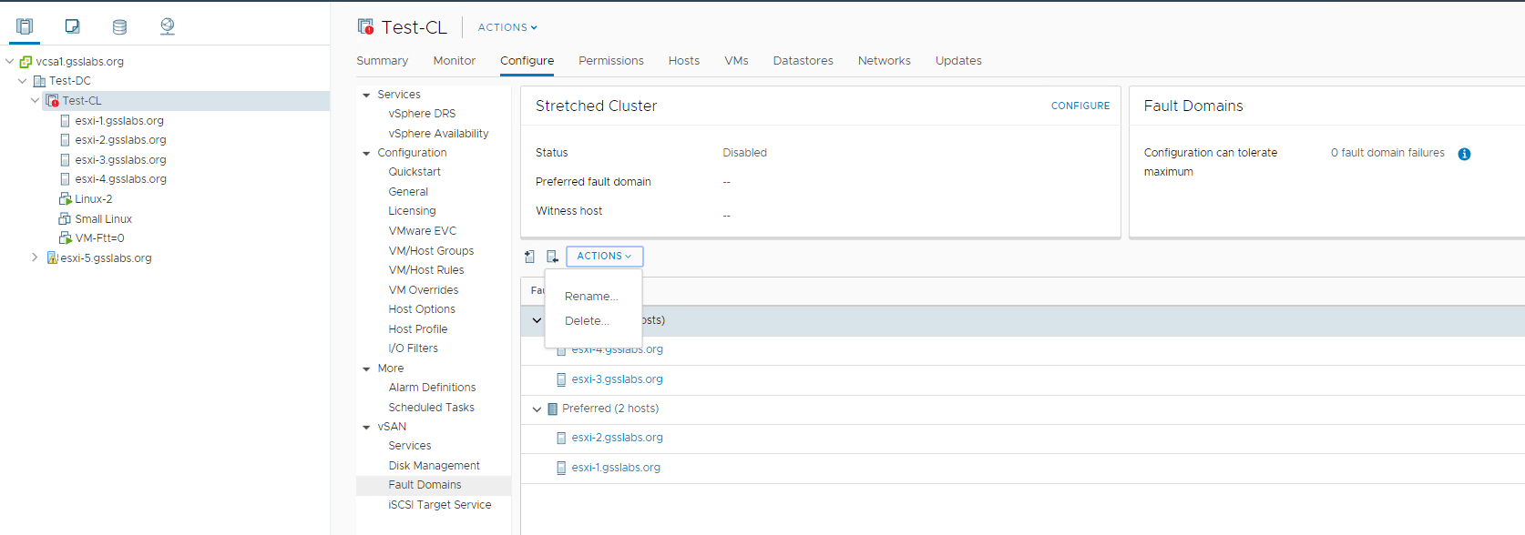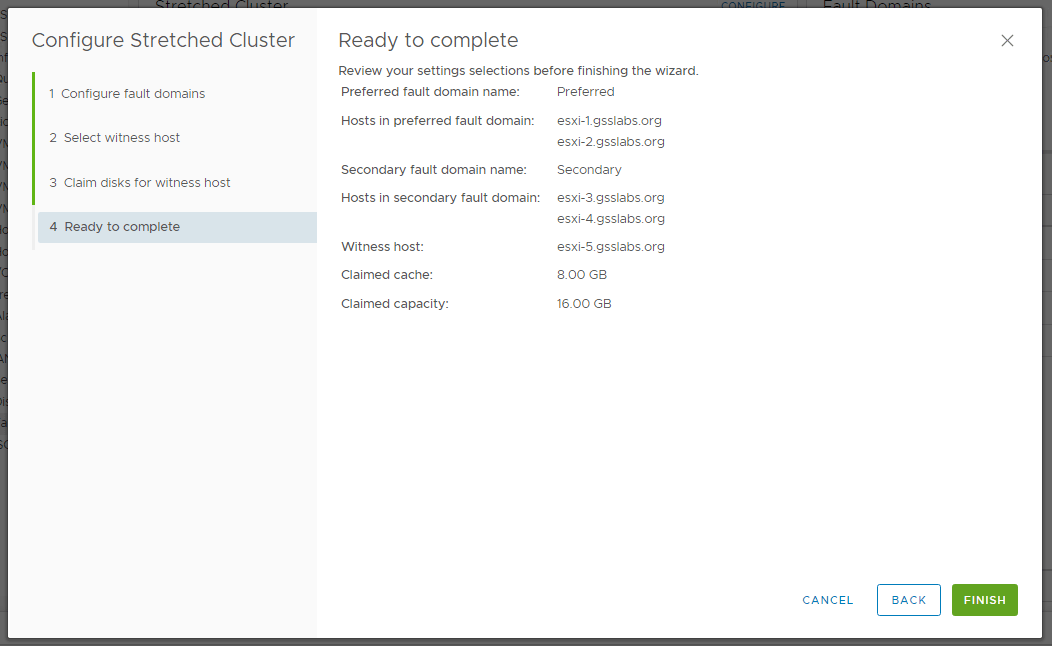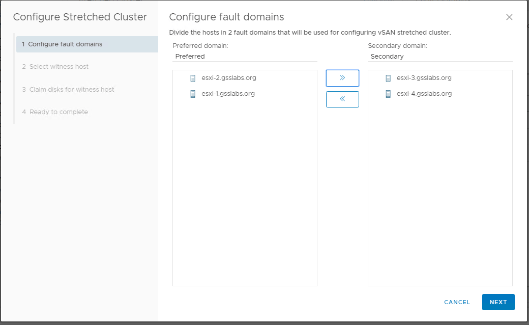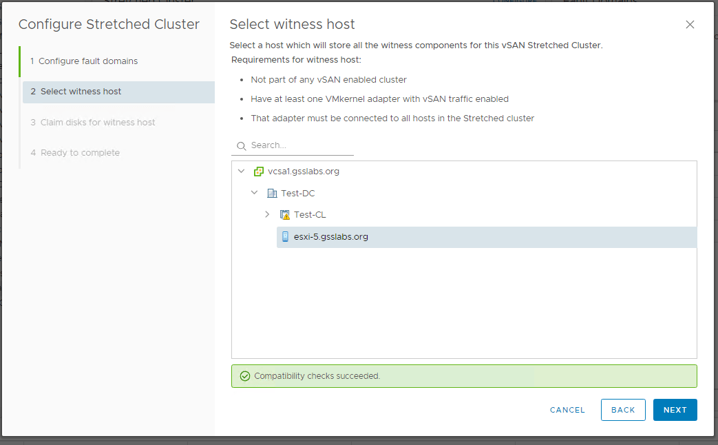 In my setup (These are nested ESXi hosts not physical ones) I would like to use esxi-1-1 and esxi-1-2 on primary/Preferred Site and esxi-3, esxi-4 on the Secondary site . I have added a witness appliance esxi-5 to the Datacenter as a host which is deployed on a different cluster.