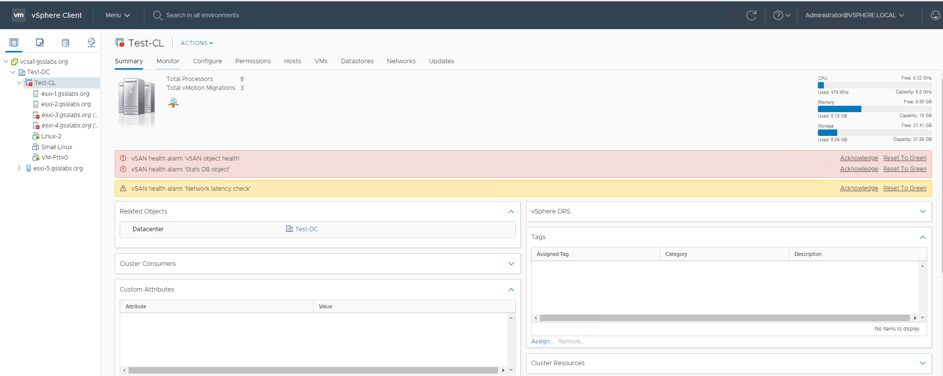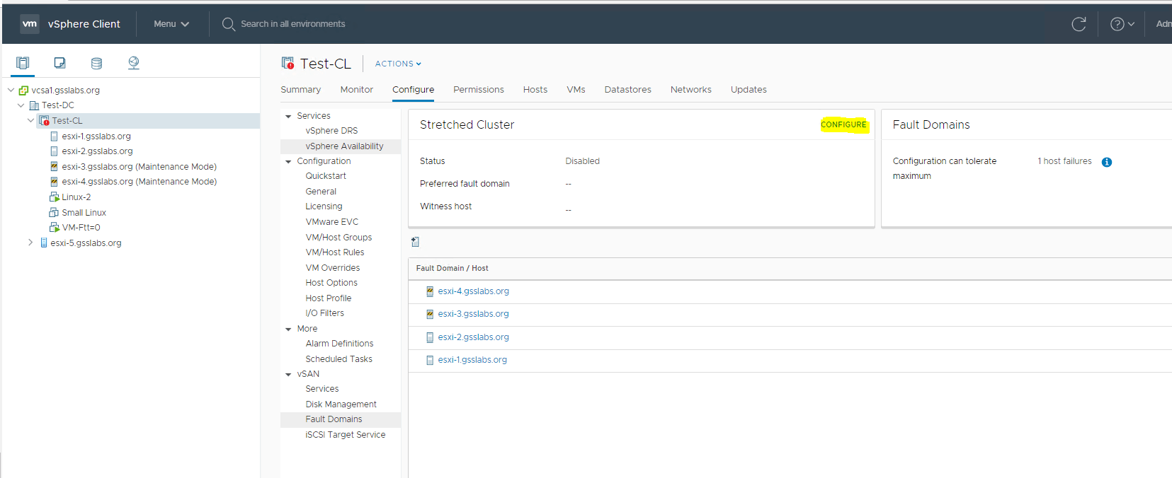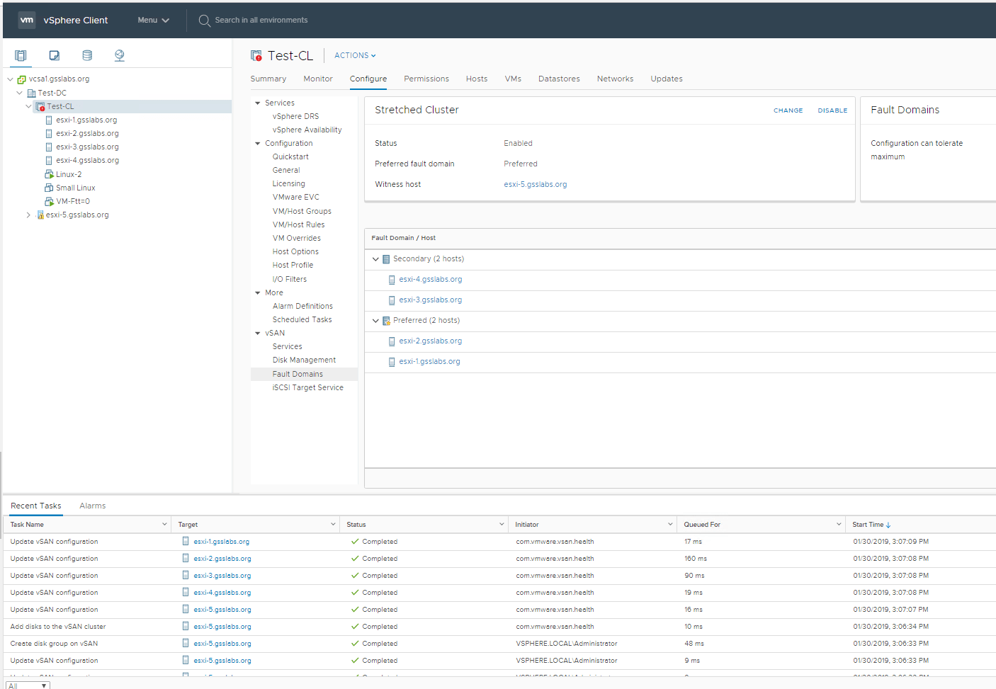 In my setup (These are nested ESXi hosts not physical ones) I would like to use esxi-1-1 and esxi-1-2 on primary/Preferred Site and esxi-3, esxi-4 on the Secondary site . I have added a witness appliance esxi-5 to the Datacenter as a host which is deployed on a different cluster.