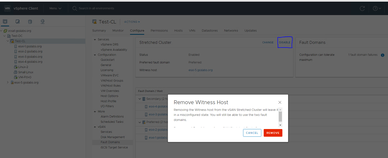 Disable stretched cluster Cluster⇒Configure⇒vSAN⇒Fault Domains⇒Stretched Cluster⇒Disable.