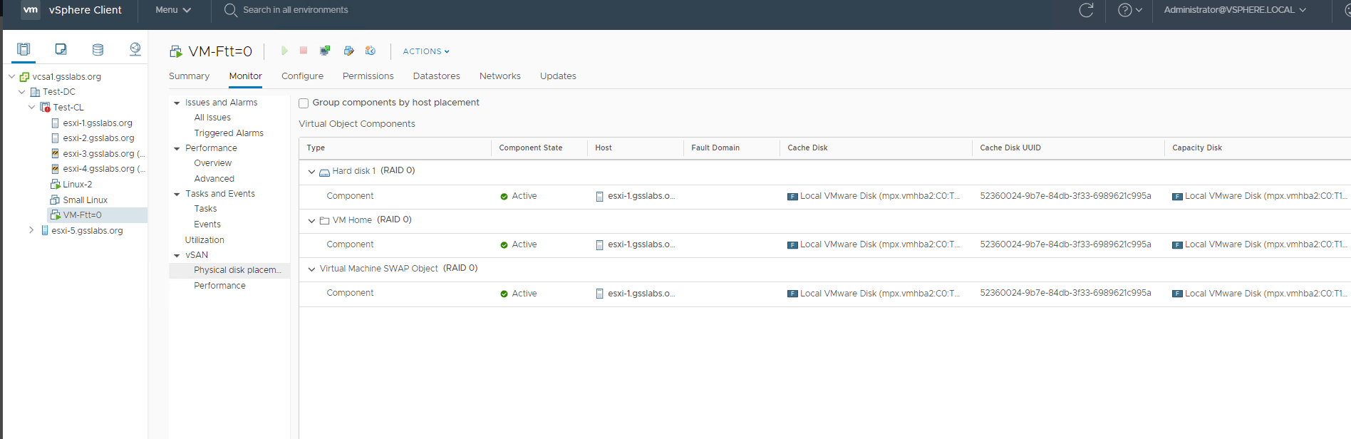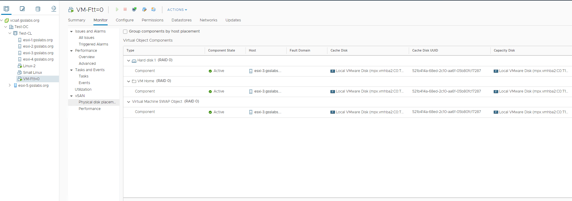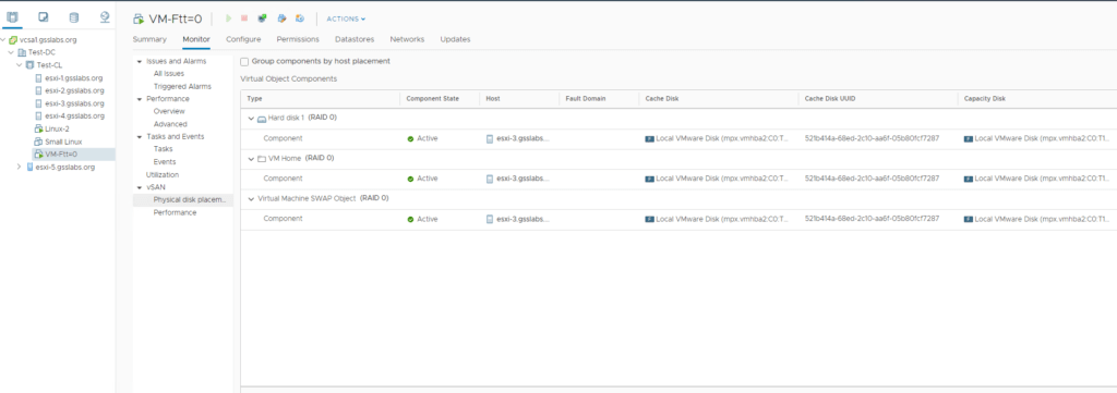 Second VM : VM-FTT-0 , has storage policy set to Ftt=0 (Raid-0) where the components for VMDK and VM home folder are on Host-03