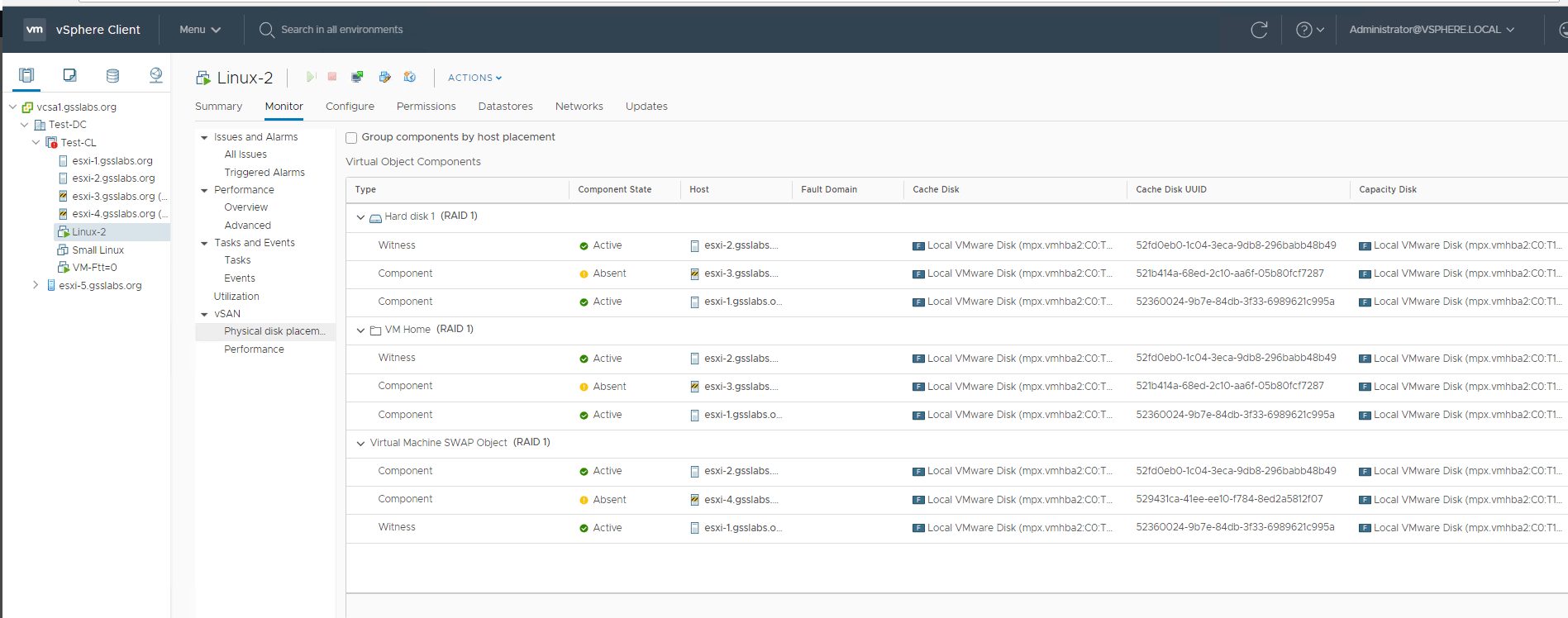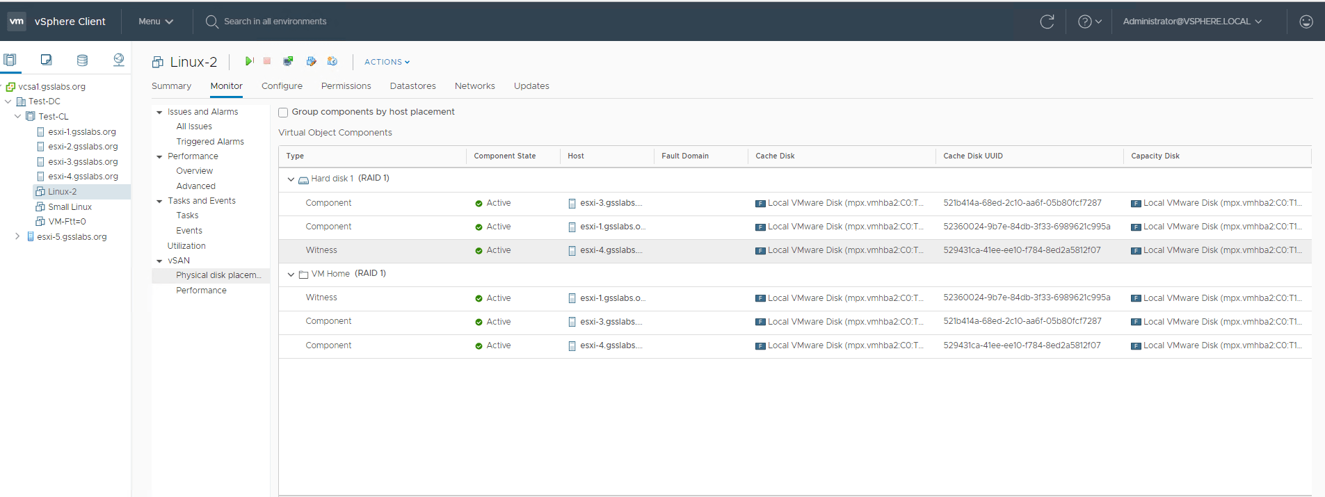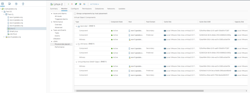 First VM : Linux-2 , has storage policy set to Ftt-1 (RAID-1) , where the components for VMDK and VM home folder are on hosts 1 , 3 and Host 4 .