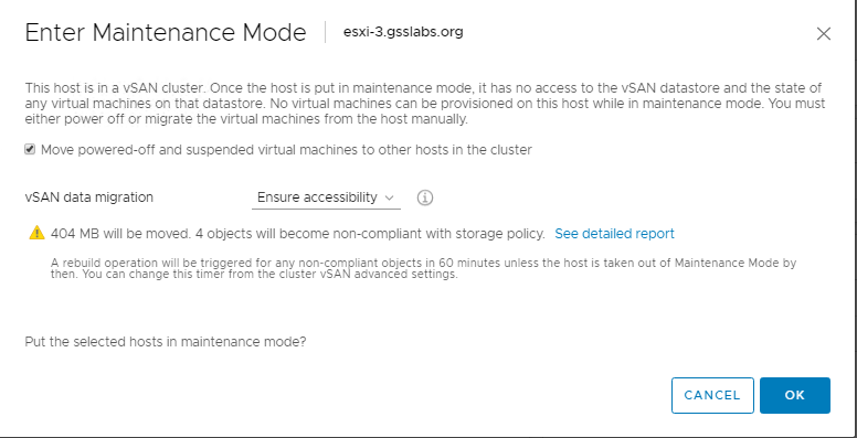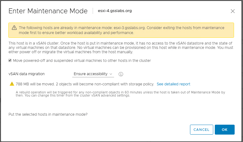 Note: As explained in the pre-requisite if you have plans to keep 3 or more nodes on each side , you will retain certain amount of hosts and place the rest of the hosts in maintenance mode , however with vSAN if we have 3 or more hosts accessible , vSAN will try to rebuild absent components on to the hosts which are not in MM mode . This may be a good thing or can cause disaster in certain cases .
