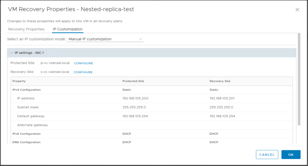 - Perform IP customization settings on the new interface is same as older versions . Navigate to the Recovery Plan ⇒ Select a Recovery Plan ⇒ Select Virtual Machines ⇒ Configure Recovery ⇒ Choose Required IP Customization options entry values in required sections . Run a test/planned Migration .