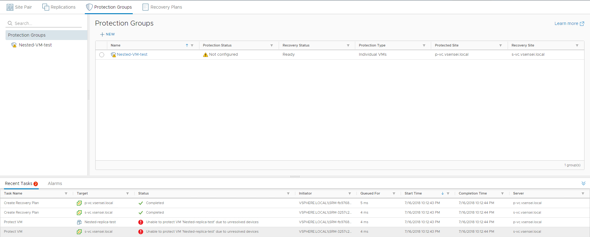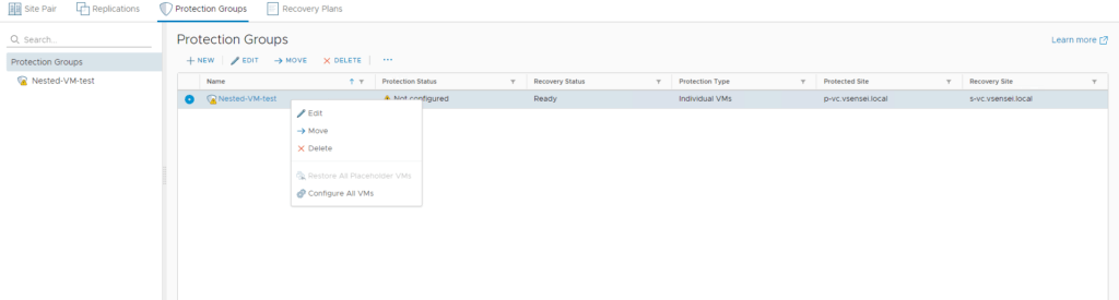 We ran into an issue with protection group “Unanle to protect VM due to unresolved devices “, which is expected as we have no mappings for network , folders , storage , resource pools, storage policy and place holder datastore from SRM perspective between the two sites . We should see the PG go back to OK state once this is successfully configured . Simply proceed to create the mappings for all the parameter successfully . Now right-click the PG and hit “Configure-All VMs” we should see the protection status go back to OK state and the place-holder created at DR site.