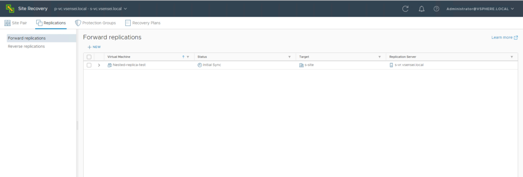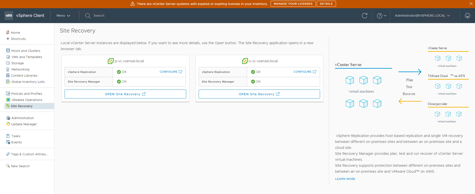 - When we click on Open site recovery a new tab opens with the IP address of the vSphere-replication appliance-IP/UI for the respective site . I also found that the UI remains the same if we open up the IP address of SRM-server/UI , there is no difference between the UI as demonstrated below .