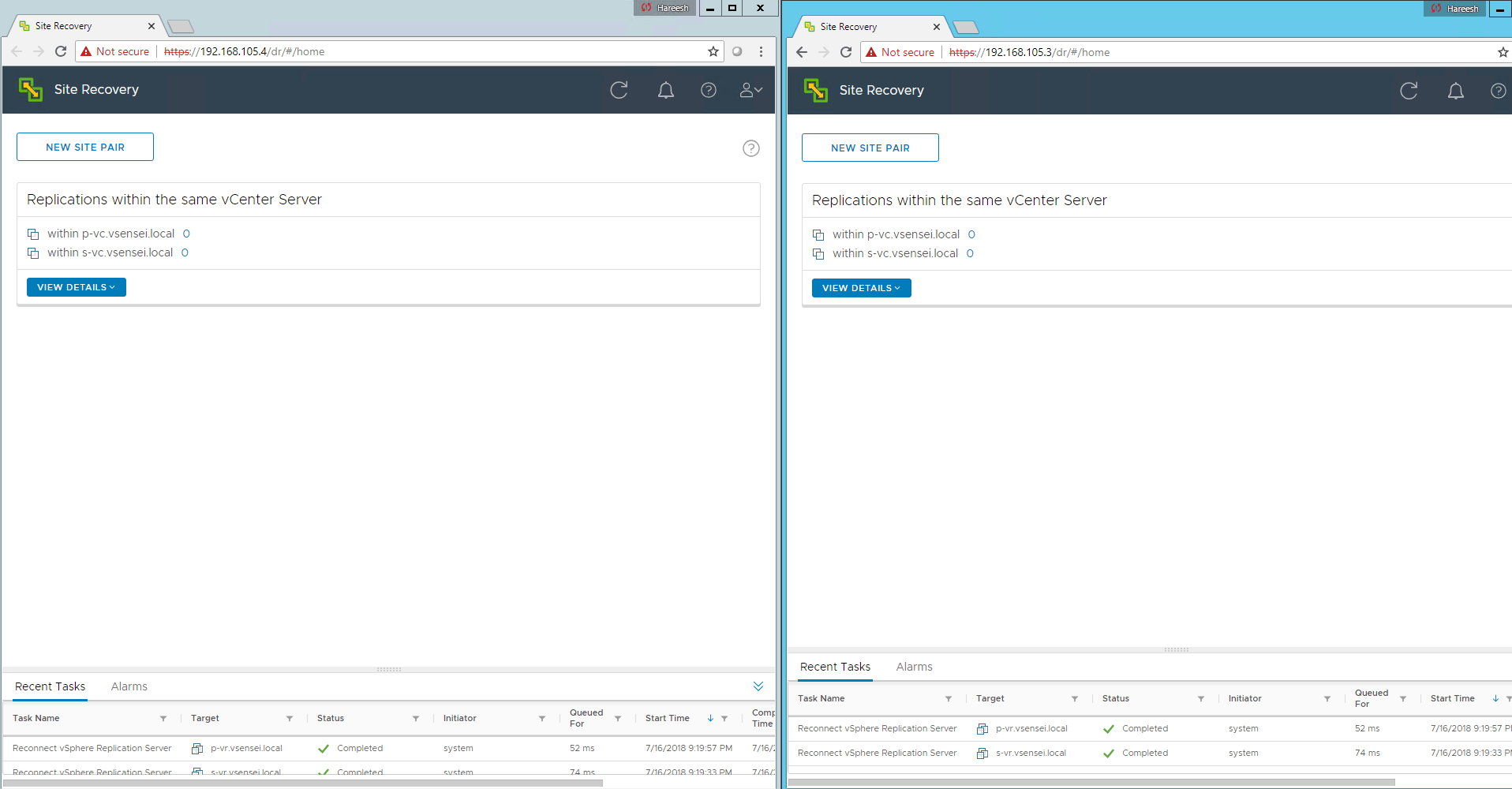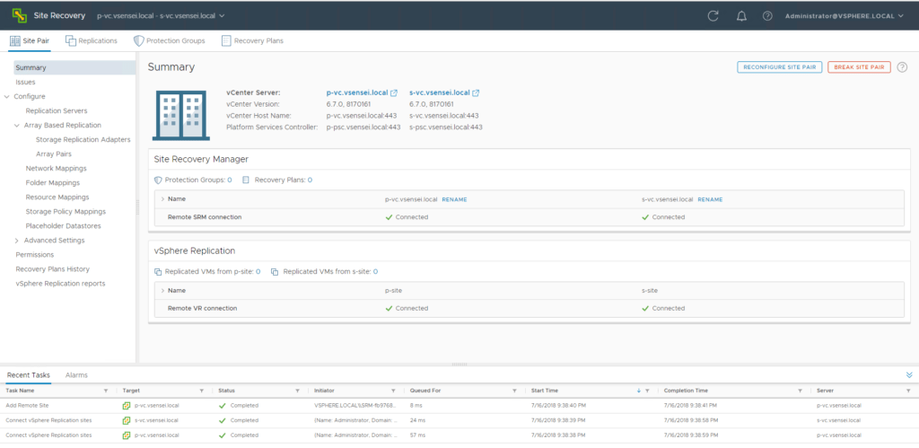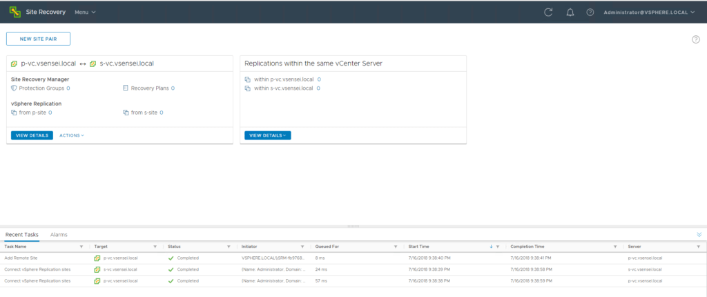 - The task will take about a minute to complete the Site-Pairing we see the pairing task for both SRM and vSphere Replication . We can now hit the view details button and we land at the Summary section which shows the status of Site pairs for SRM and vsphere replication and their health status.