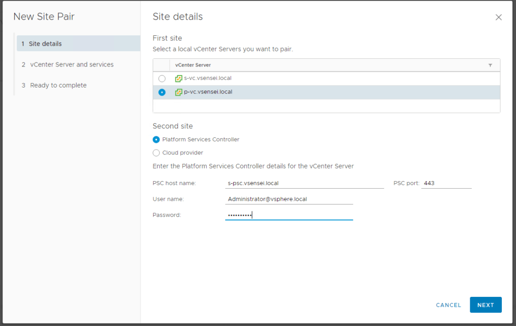 Deployed PSC one first primary site and one for the secondary site within the same SSO domain but different site names .