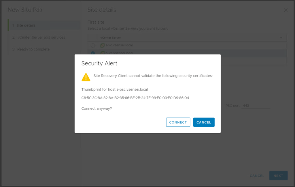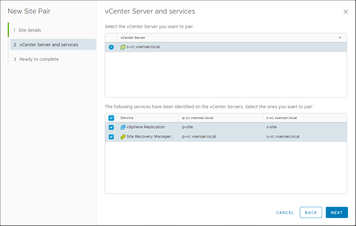 Perform initial site paring which pretty much straight forward . Please note while pairing the two sites you will note both VR and SRM service will be detected at scondary site and you can pair them in the same window .