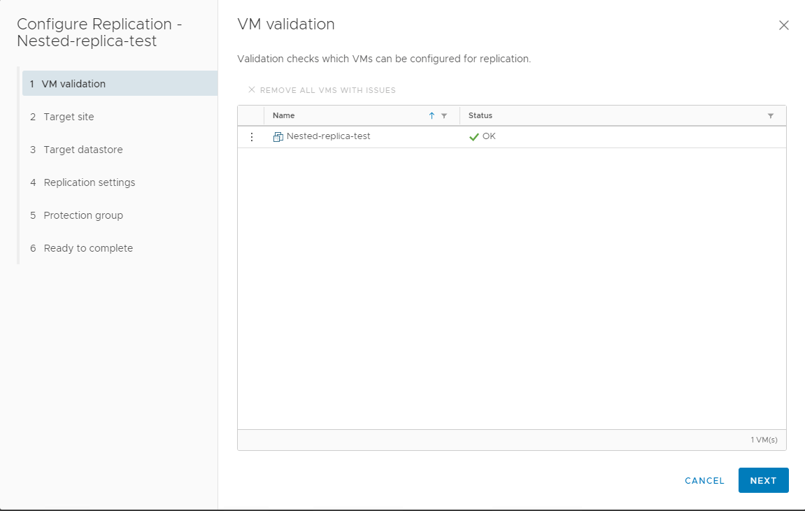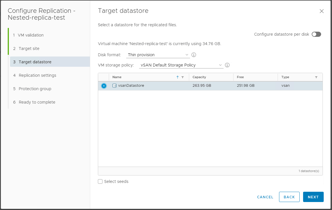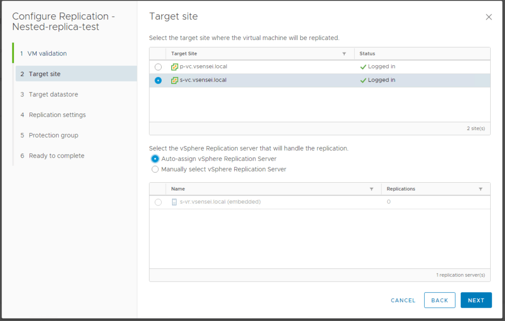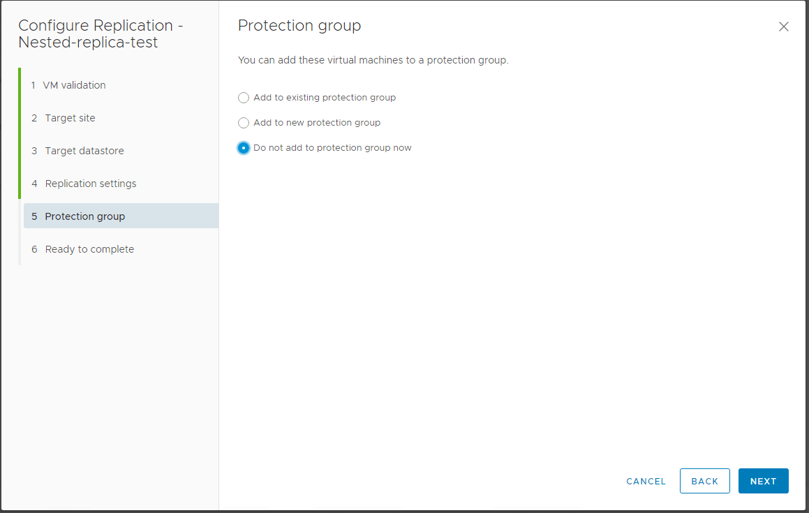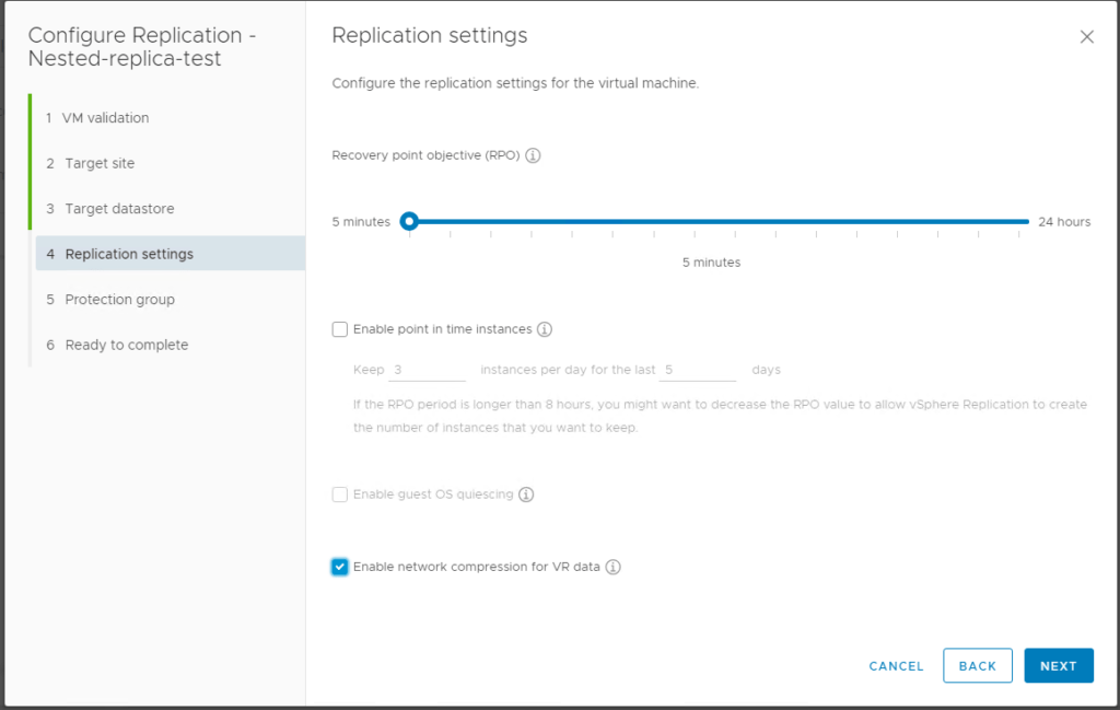 - Configure replication for one of the virtual machine , here I have just used a nested ESXI OVF template called “Nested-replica-test” on the primary site for test purpose and we shall see how replication is now configured with new UI which is totally different from how it was done in previous versions . When we right-click the VM ⇒ SIte Recovery ⇒ Configure replication , it now pops-up a new tab and the configuration for vsphere-replication is continued thru the new-UI for SRM/VR . Here we have to just follow the wizard by choosing the Target-site , datastore, storage policy at target site , RPO value which allows as low as 5 mins (earlier version only support 15 mins or higher this is new) , we can also enable network compression . We are allowed to even create the protection group or add to an existing one which will make our life so much easy as we can save a lot of time to create or add the VMs to a protection group from site recovery menu in previous versions . Finally the replication status will now reflect under replications tab from the new-UI .