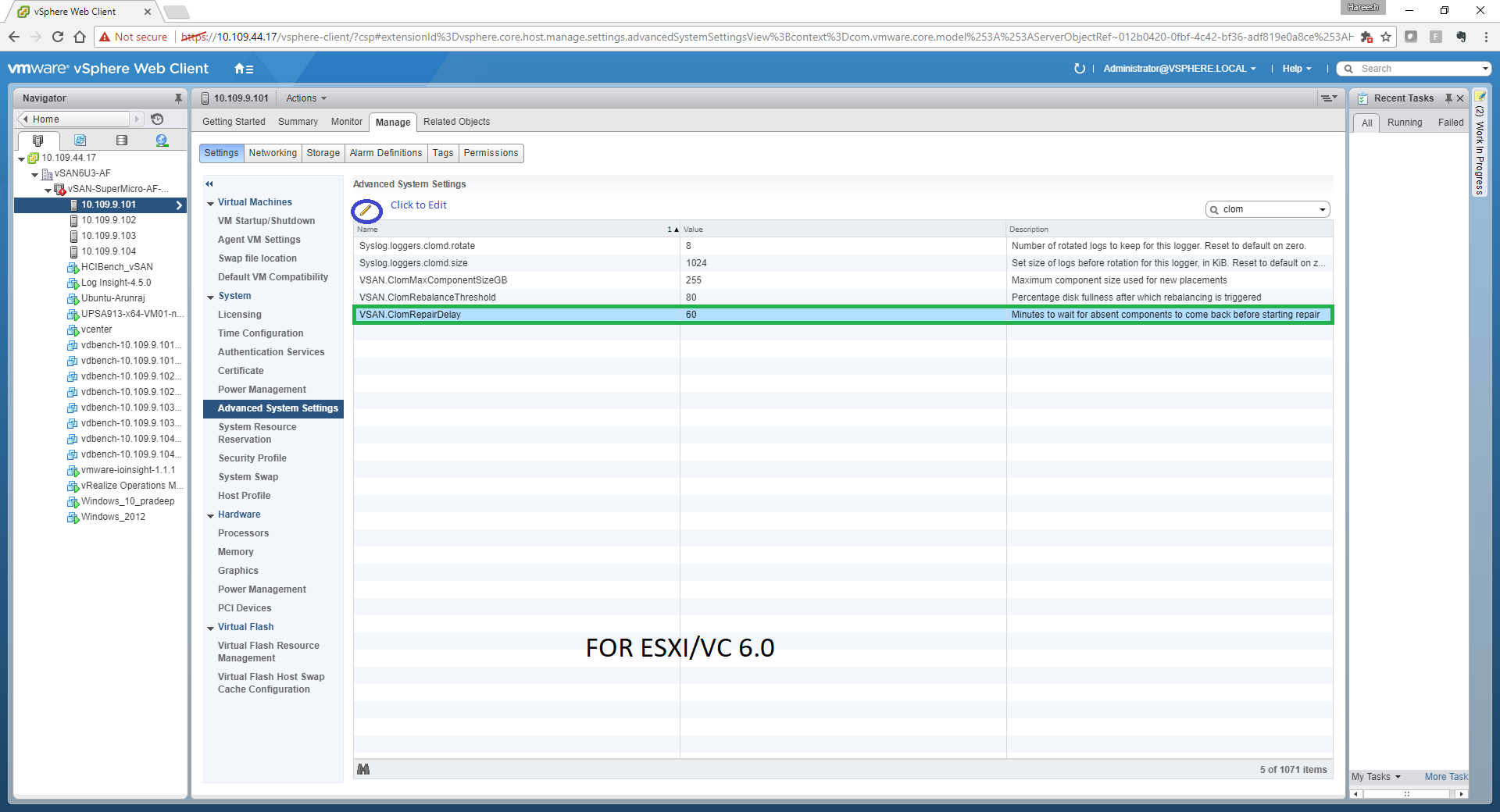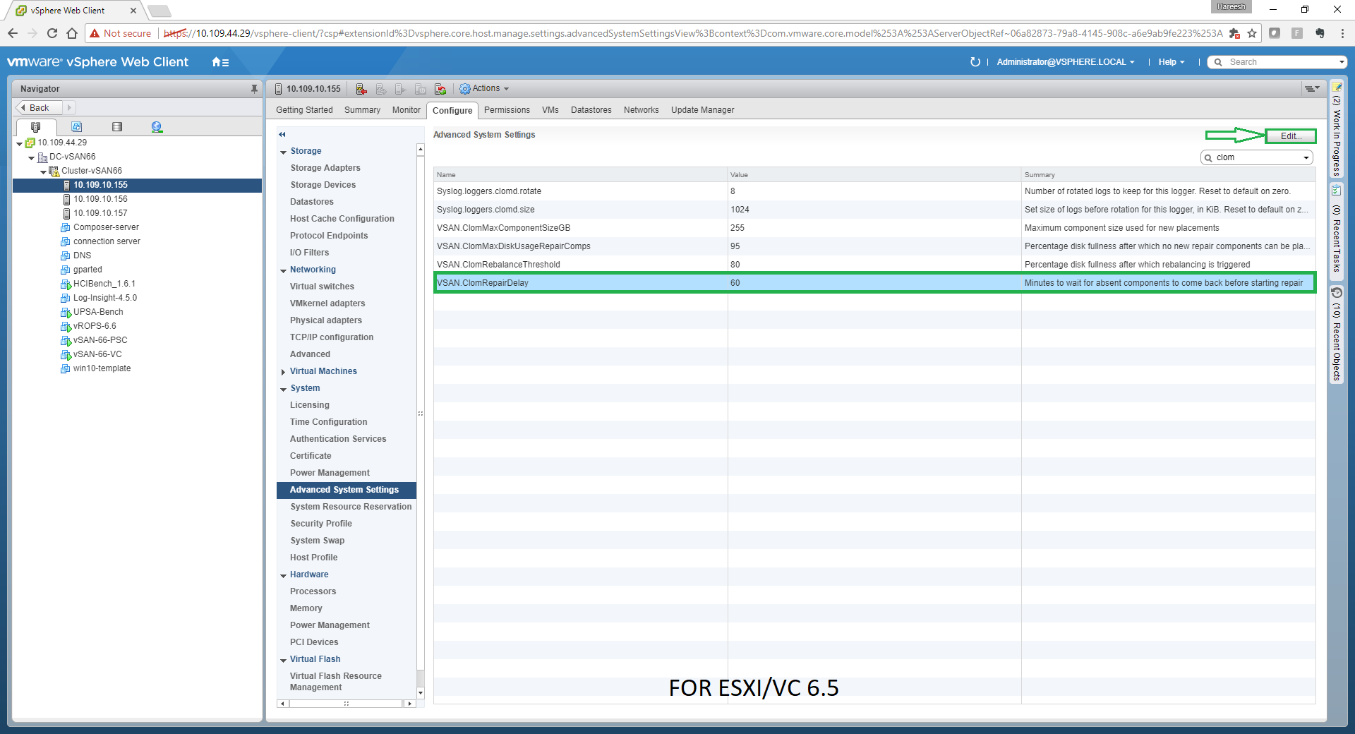 - **Step4 : **Increase the clom repair delay to two hours (120 mins) ONLY when you think you will need more than one hour to complete the reboot on one of the host without rebuild kick off which will causing complete resync for the components that are currently residing the host which is about to be placed in maintenance to other hosts in the cluster, proceed to put one host in maintenance mode with ensure accessibility option from the Webclient , if the DRS is not fully automated , you will have to manually move (vMotion) the VMs to other hosts . Below are the screenshots from both 6.0 and 6.5 versions where the wizard might look slightly different while changing the value clom repair delay .
