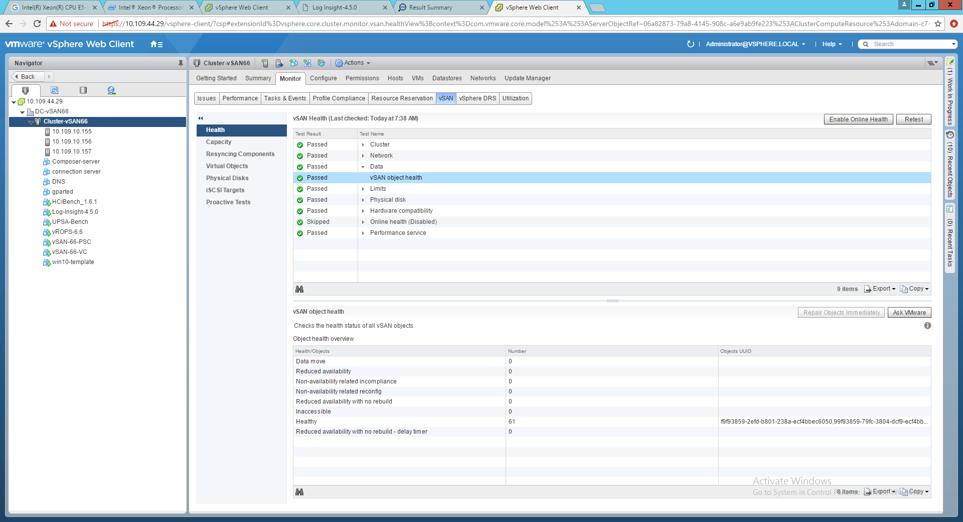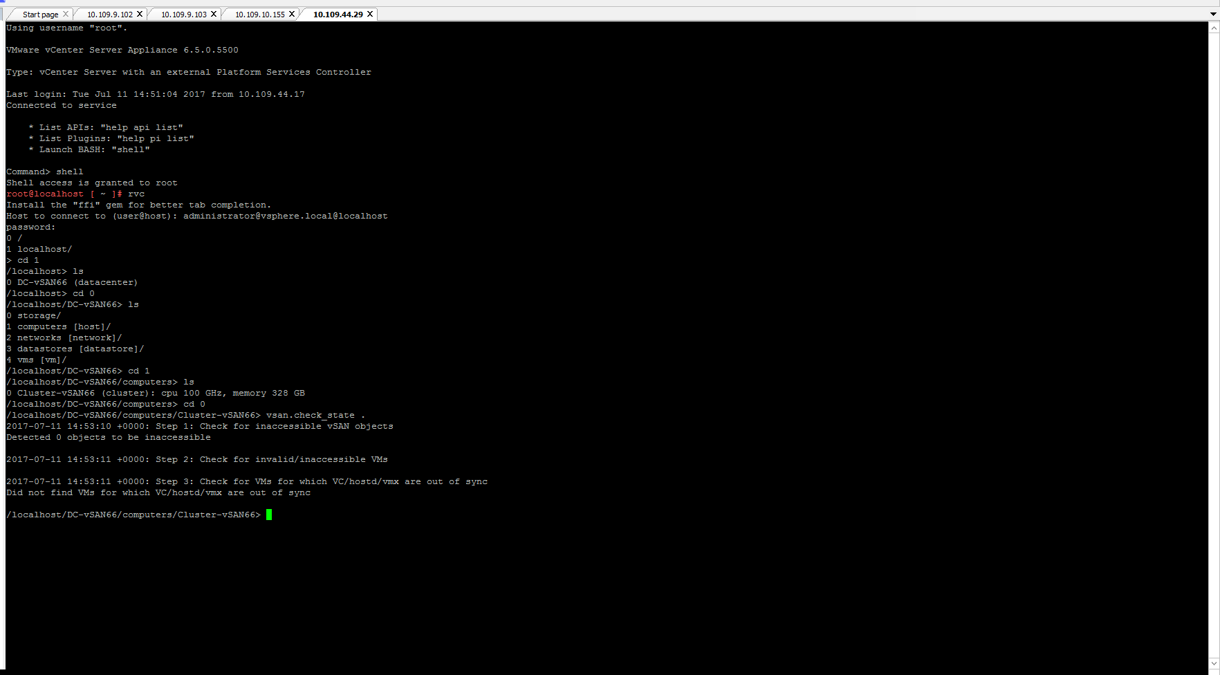 - Step2 : Check for possible inaccessible objects and VMs .Easiest way is to go the health plugin (works only if we are 6.2 and above release) to see if there were any inaccessible objects , I however recommend you to use and familiarize with RVC commands as this would be your best friend !!.Its also easy to check the same status from the RVC command line on your vcenter server where your vSAN cluster resides . Please see RVC command line guide here , .First log into RVC console (see how-to-login to RVC) , change directory to the vSAN cluster , next run vsan.check_state to look for any inaccessible objects