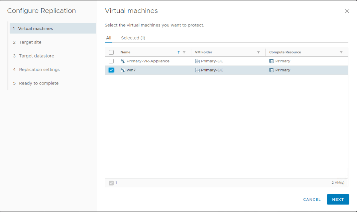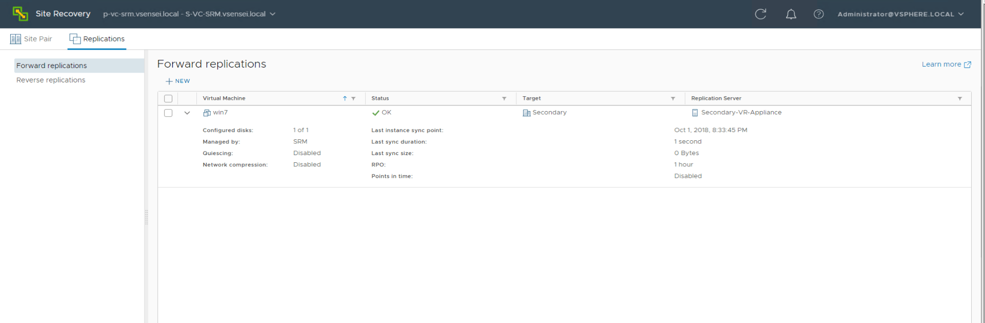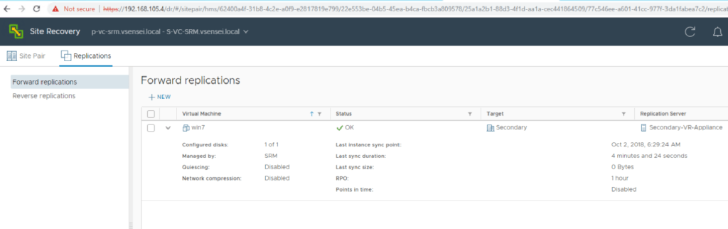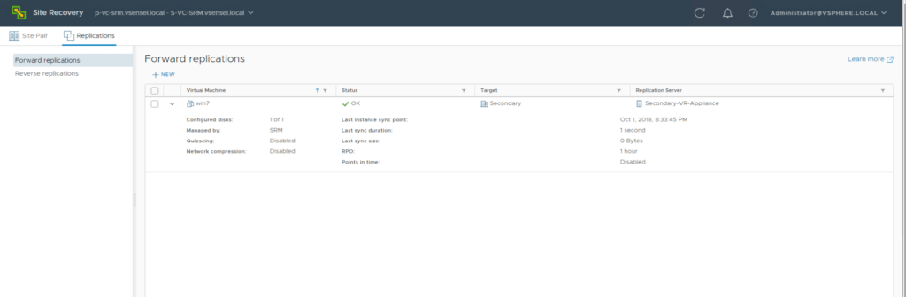 Three node vSAN cluster running vSAN 6.7 at both Primary and Secondary Site . We are using VR version 8.1 in this illustration . We have a VM called win7 which is being replicated from source to Target Site .