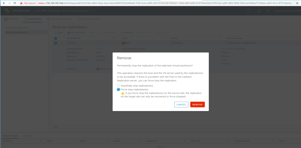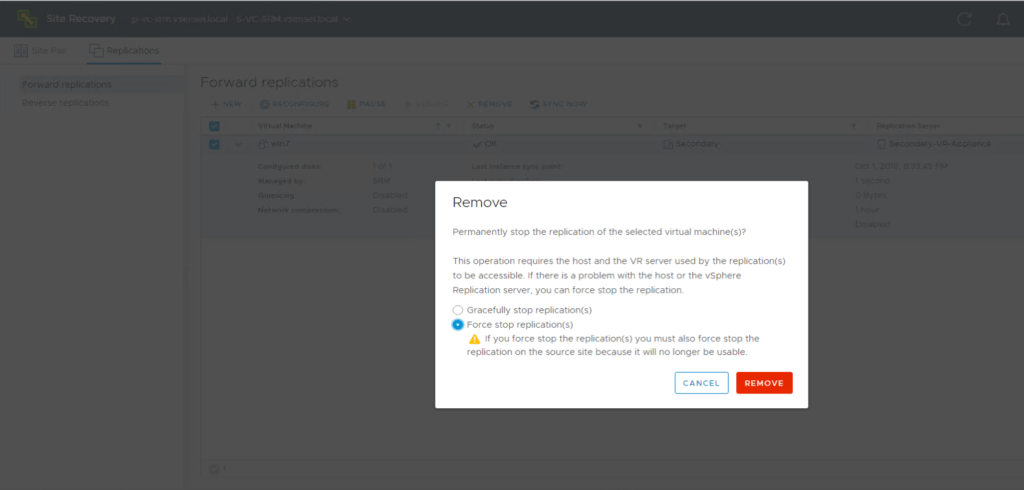 Now that we have moved all the files from the original folder , we are safe to force stop the replication from the incoming direction at the target site , since there are no files / vmdks on the original folder there will be no deletion task against the vmdk objects , vcenter server will also report a vmdk deletion task failure .
