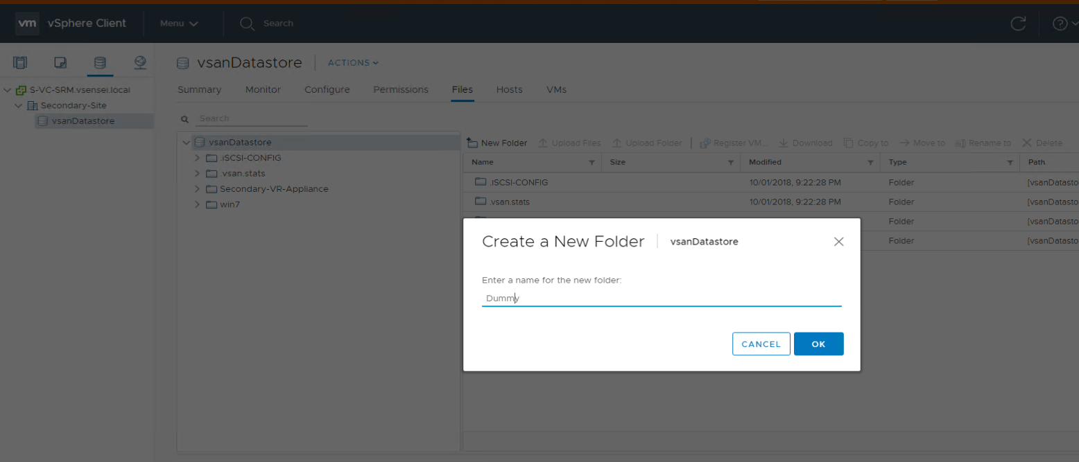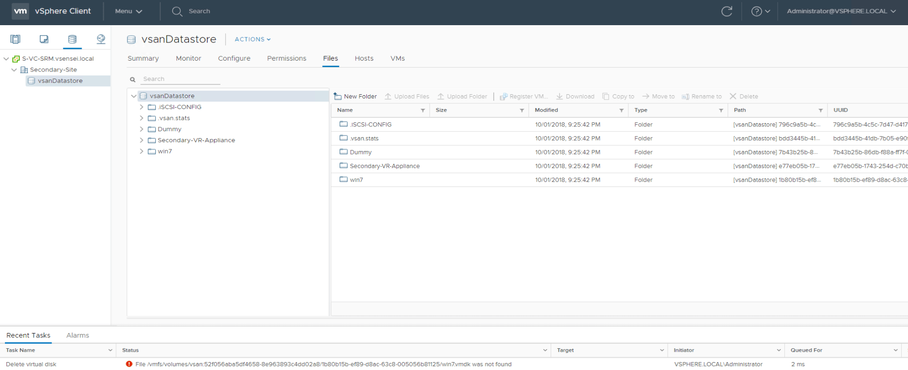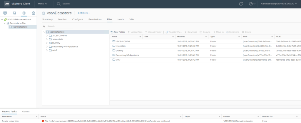 Now that we have successfully stopped replication from both source and the target site . We are good to copy just the actual vmdk object , here in this case win7.vmdk from the “Dummy” folder back to original target folder . The reason we dont have to copy the other files is because when we reconfigure replication from the source site , we will create a new RDID and respective HBR-RDID vmdk for the replication session , the current files are no longer valid/required .
