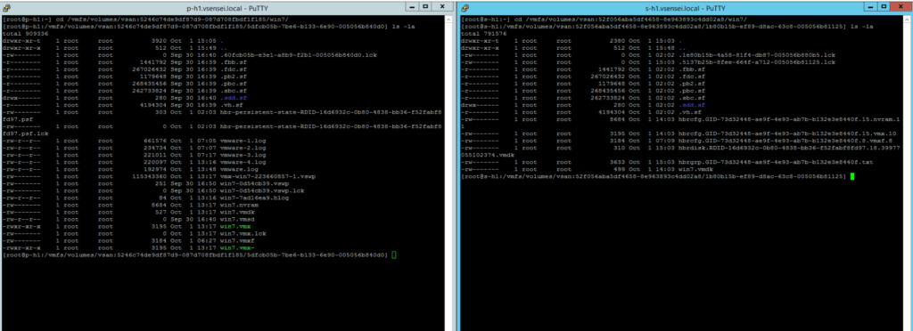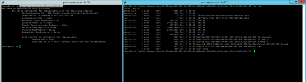 Lets look at the replication configuration from Source and the destination objects at the DR site . Here we see the VMDK which is being replicated from source host p-h1.vsensei.local for the VM “win-7” which has a vDisk called win7.vmdk , replication ID for this VMDK is RDID-16d6932c-0b80-4838-bb36-f52fabf8fd97 (see on the left hand side under get-config details using command “vim-cmd hbrsvc/vmreplica.getConfig VM-ID”). On the Right side we see the datastore⇒NameSpace path where the VM is being replicated to . This contains the hbrdisks (vmdk) with respective RDID disk/ (Journal disk) i.e “hbrdisk.RDID-16d6932c-0b80-4838-bb36-f52fabf8fd97.18.39977055102374.vmdk” and the respective base disk for that VM which is in this case is again win7.vmdk (At the Target Site)