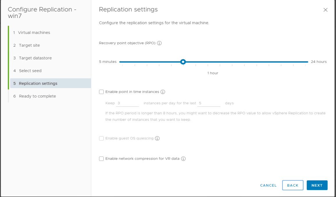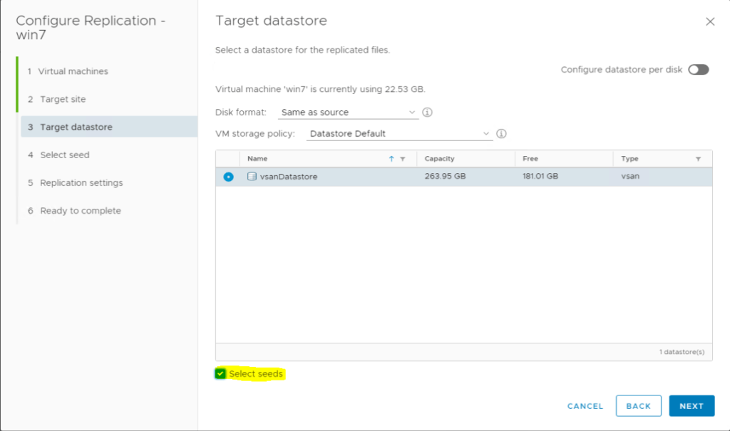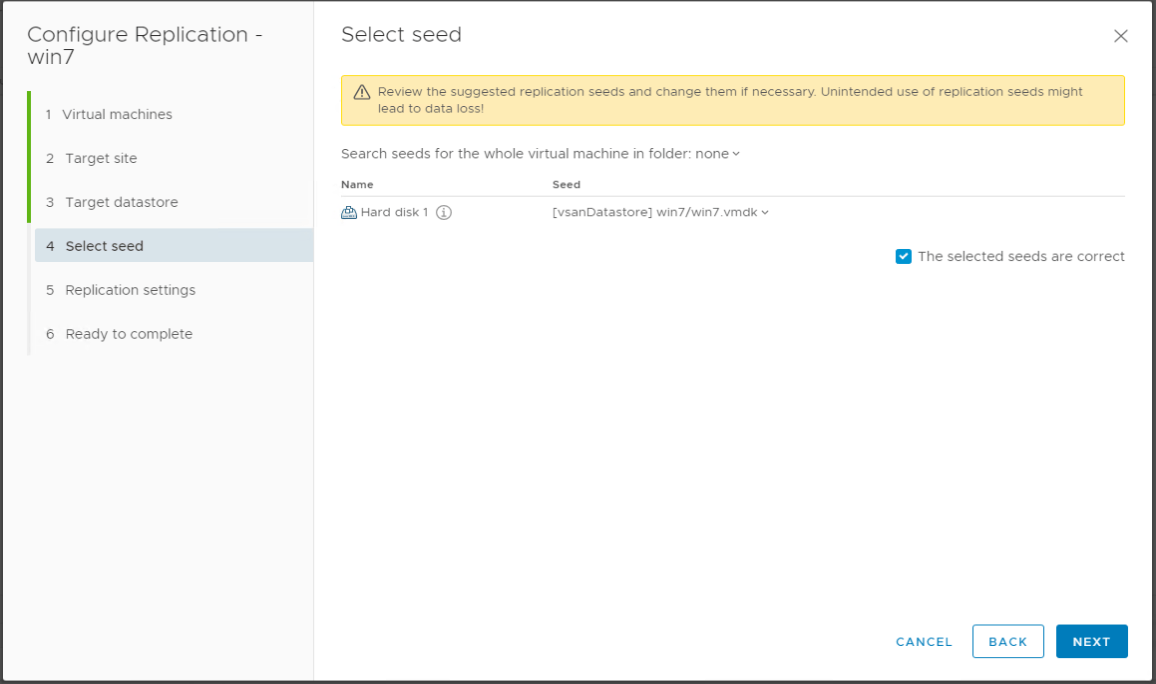 We can now safely re-replicate the VM from the source to the same target folder using existing seeds , avoid a full-sync replication and only replicate the delta-changes to the Target .