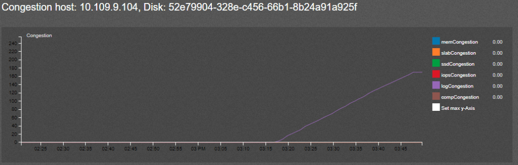 - From section vSAN-More and congestion , we see that the Log congestion against host-04 was very high , this log congestion might be due to the fact that the number of IOPS against host-04 was very high and the write logs from above graphs was constantly increasing , hence the host had to build up log congestion to get some time to elevate the data from write buffer down to capacity tier drive .