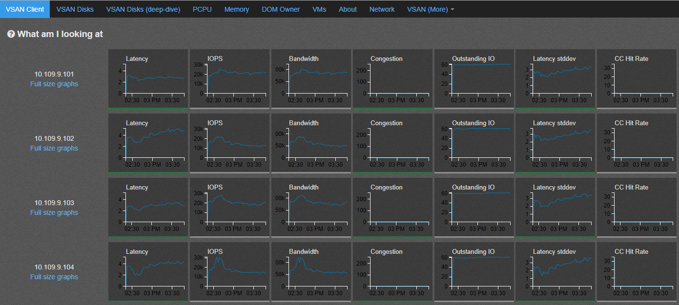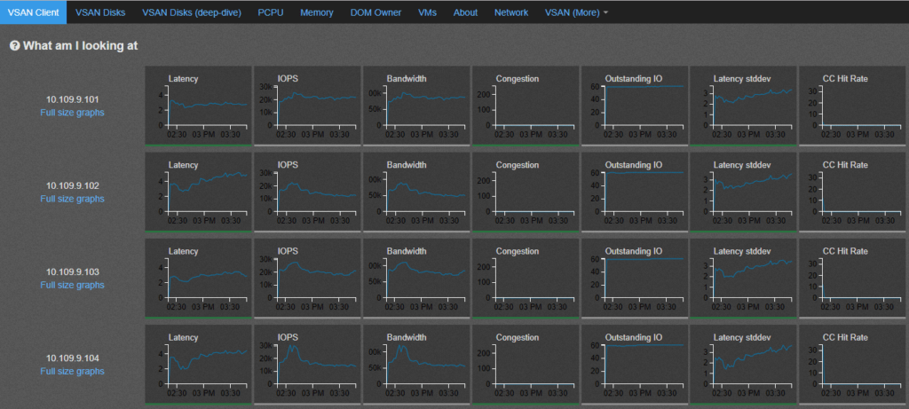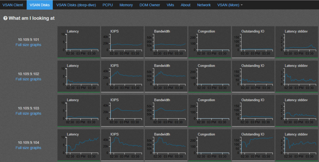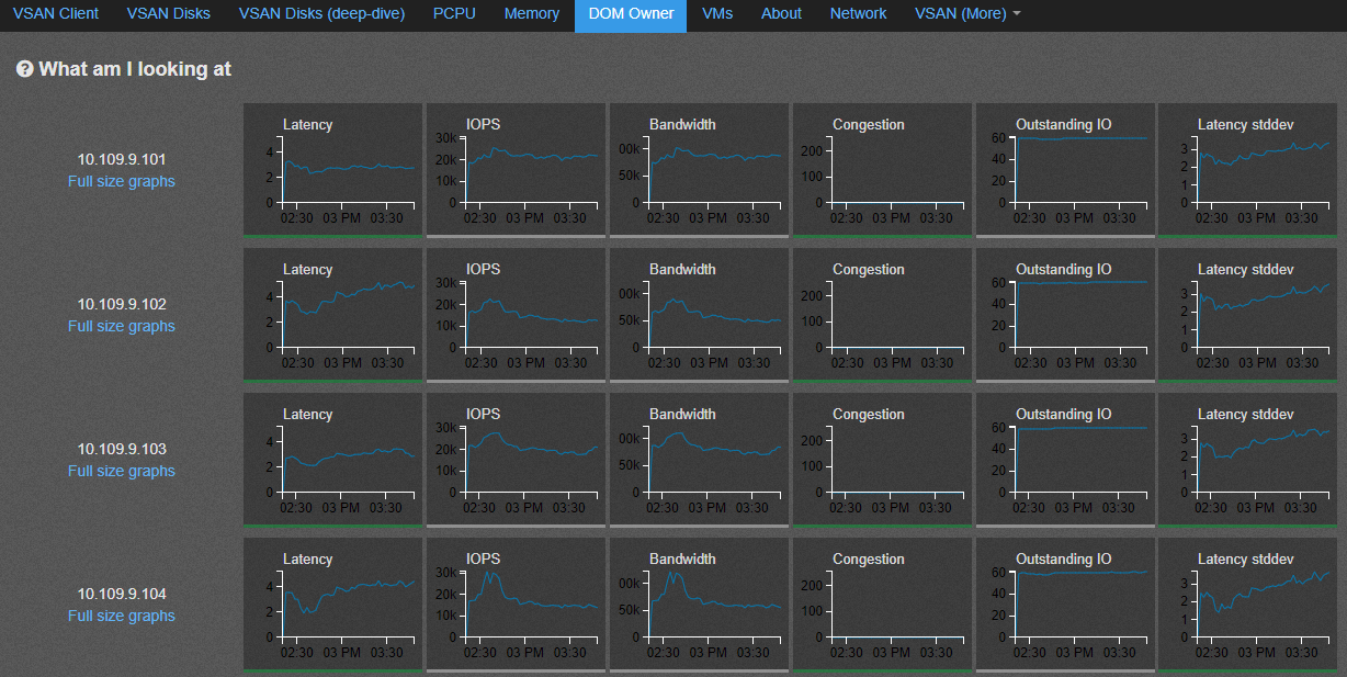 - DOM-Owner – This graphs displays the throughput and latency values seen at layer just before IO traverses thru vSAN back-end file-system which is the object-owner level latency .
