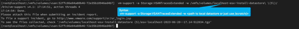 Syntax: vm-support -a Storage:VSANTracesExtended -w <localdatastore path or /scratch/>
