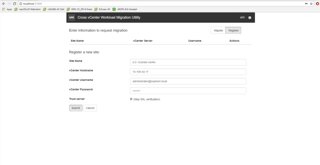 4. Now I added two vcenter server to kick off an xVmotion task , on the landing page select : Migrate ⇒ Register , you will be asked to fill up your site deteails , vcenter hostname/user/password and submit . Follow the same proceed to add both your source and destination vcenter server . Here I chose a 6.0 vcenter as my source and a 6.5U1c Vcenter as my destination (Note**: These are not in the same SSO Domain)