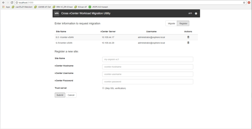 4. Now I added two vcenter server to kick off an xVmotion task , on the landing page select : Migrate ⇒ Register , you will be asked to fill up your site deteails , vcenter hostname/user/password and submit . Follow the same proceed to add both your source and destination vcenter server . Here I chose a 6.0 vcenter as my source and a 6.5U1c Vcenter as my destination (Note**: These are not in the same SSO Domain)