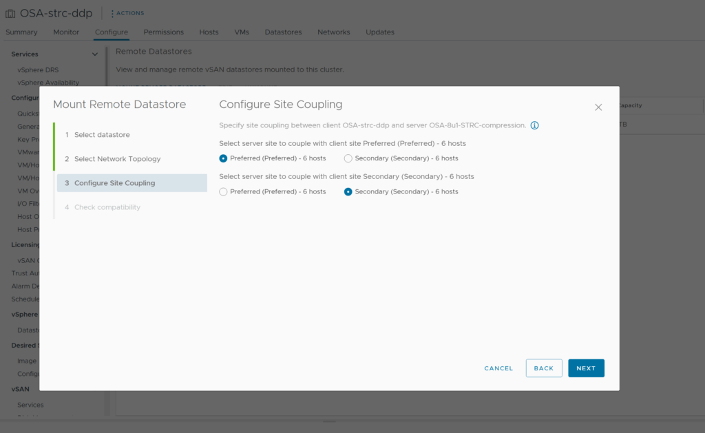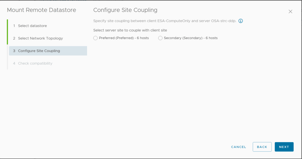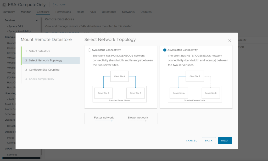 Similar to above steps when presenting a remote datastore from the server cluster which is a stretched cluster to a standard vSAN cluster or a compute only cluster , you will be asked to pick the correct topology to make sure that all VMs created on the compute-only cluster or a standard vSAN cluster will get the least latency from remote vSAN datastore.