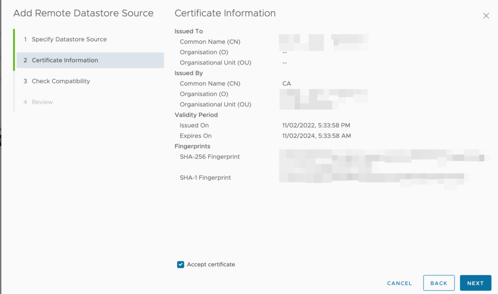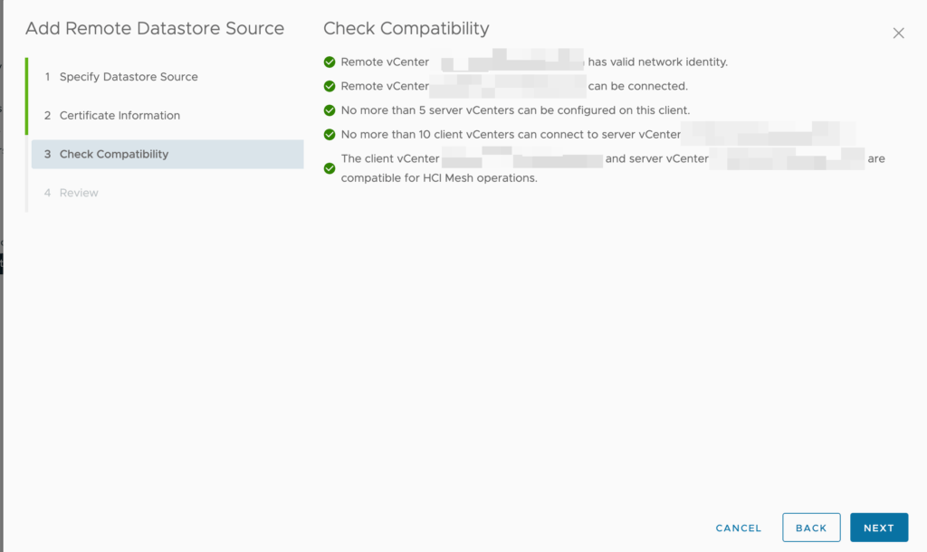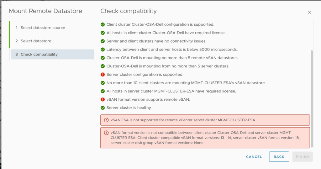 Attempting to add an ESA datastore from a remote vCenter server will will Compatibility check while adding a remote datastore at the cluster level. If the Client Cluster and Server cluster are running different ESXi versions or On-Disk-Format version Compatibility checks will prevent mounting of Remote Datastore.