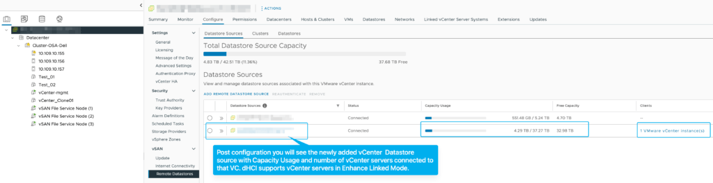 We now have support for mounting remote vSAN Datastore (dHCI) across one or more vCenter servers for vSAN clusters running Original Storage Architecture.All existing workflows and pre-checks have been updated to accommodate disaggregation connectivity across vCenter Servers. To support such connections, it shall be assumed that participating clusters are running vSAN 8 U1 or greater, with all participating vCenter Servers running the very latest version. Mounting remote ESA vSAN Datastore cross vcenter functionality is yet not supported in this release.
