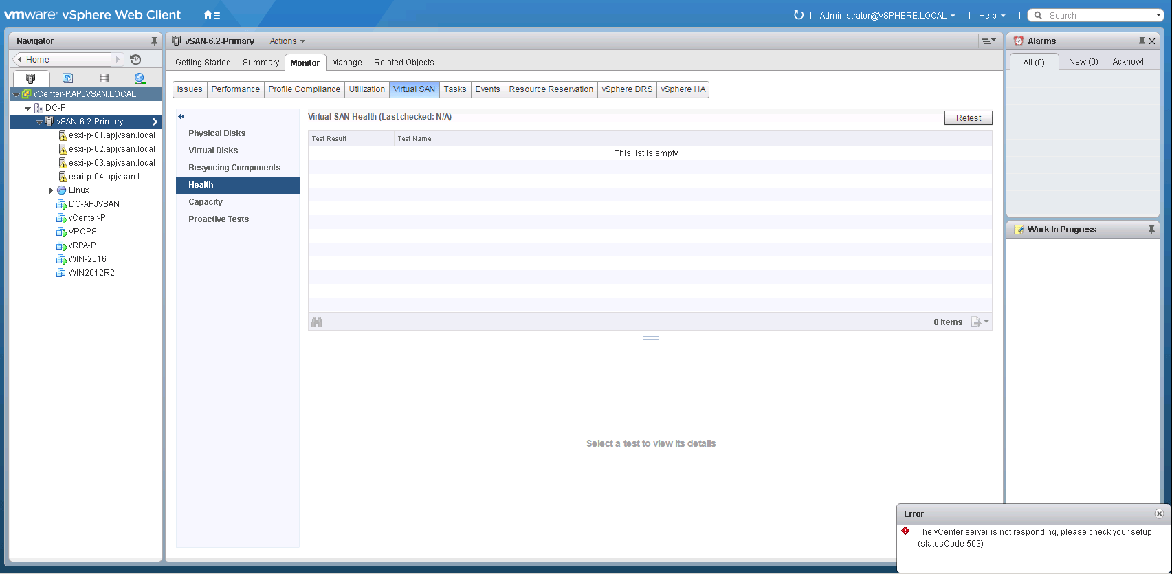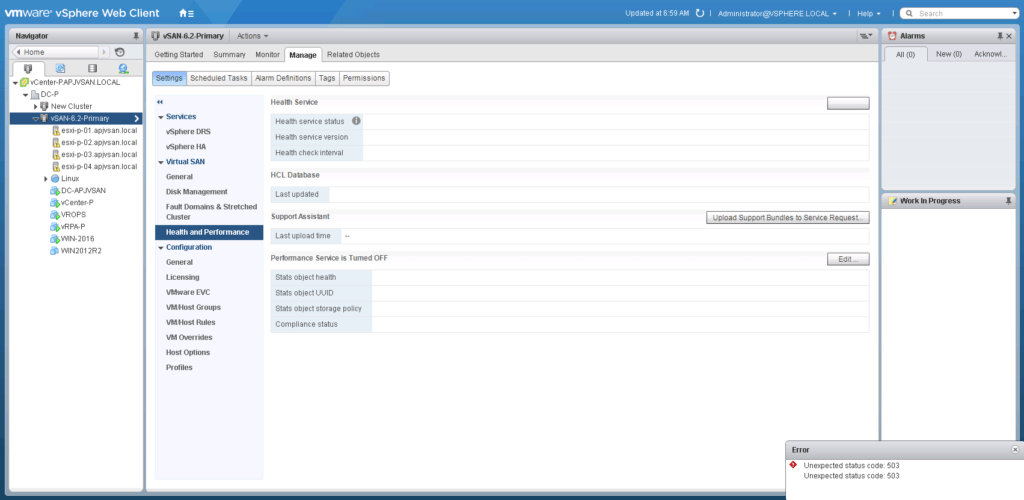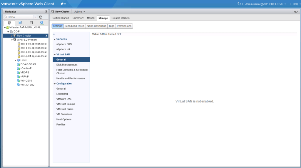 Here is an example where we have manually stopped the vSAN health service on a vCenter server running 6.0 Update 3 latest patch . We clearly see that the vSAN health plugin shows no data , even the vSAN General , Disk Management and Health and performance service doesnot show any information .I also created a new cluster and later tried to enable vSAN , however we dont see the option to turn on vSAN . These set off issues clearly indicates problem with the health service plugin on the vCenter server (VMware-vsan-health service) which is responsible for these issues .