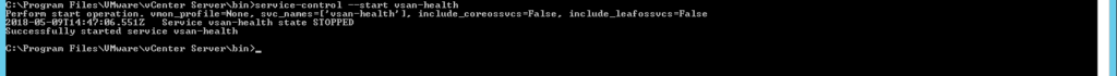 Start the service by running : vCenter-P:~ # service-control --start vmware-vsan-health INFO:root:Service: vmware-vsan-health, Action: start Service: vmware-vsan-health, Action: start 2018-05-09T21:48:47.624Z Running command: ['/sbin/chkconfig', u'vmware-vsan-health'] 2018-05-09T21:48:47.676Z Done running command 2018-05-09T21:48:47.676Z Running command: ['/sbin/service', u'vmware-vsan-health', 'status'] 2018-05-09T21:48:47.685Z Done running command 2018-05-09T21:48:47.685Z Running command: ['/sbin/chkconfig', '--force', u'vmware-vsan-health', 'on'] 2018-05-09T21:48:47.731Z Done running command 2018-05-09T21:48:47.732Z Running command: ['/sbin/service', u'vmware-vsan-health', 'start'] 2018-05-09T21:48:47.746Z Done running command 2018-05-09T21:48:47.746Z Successfully started service vmware-vsan-health vCenter-P:~ #