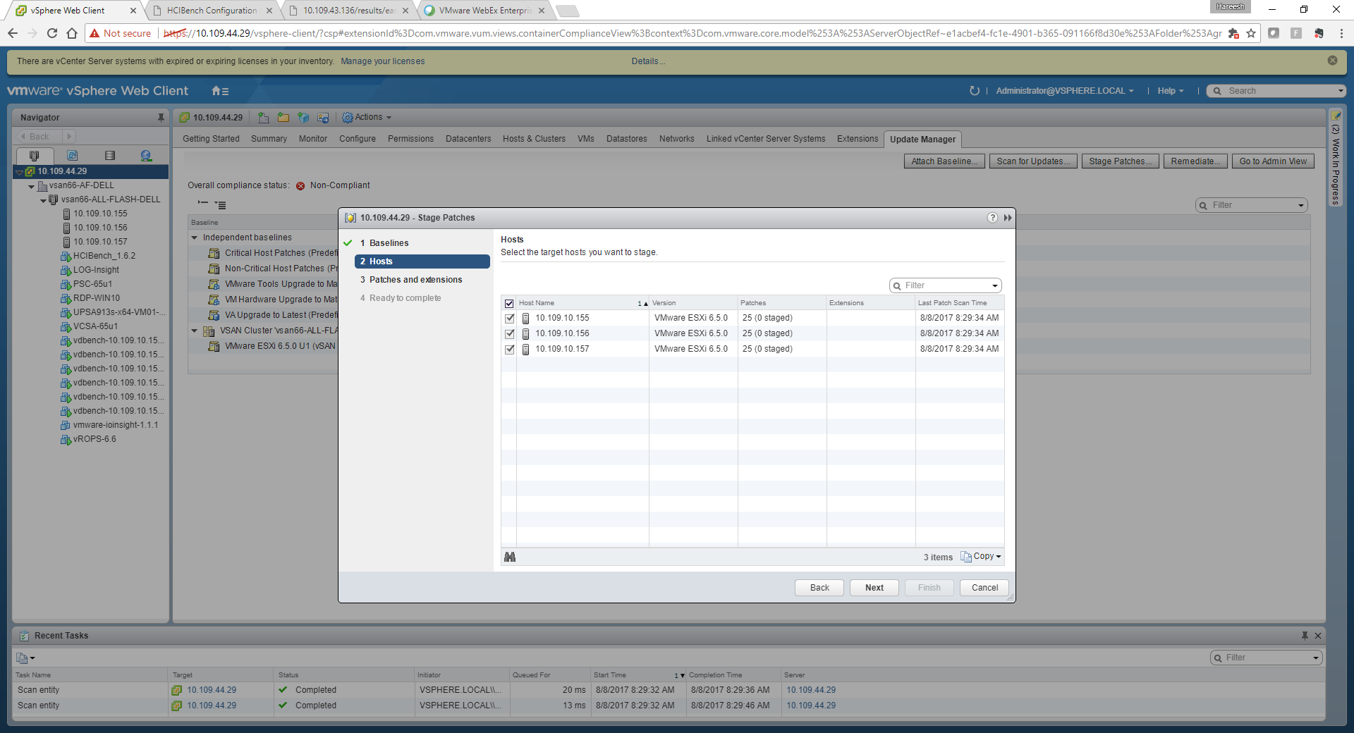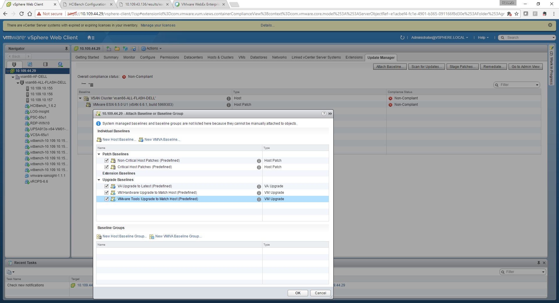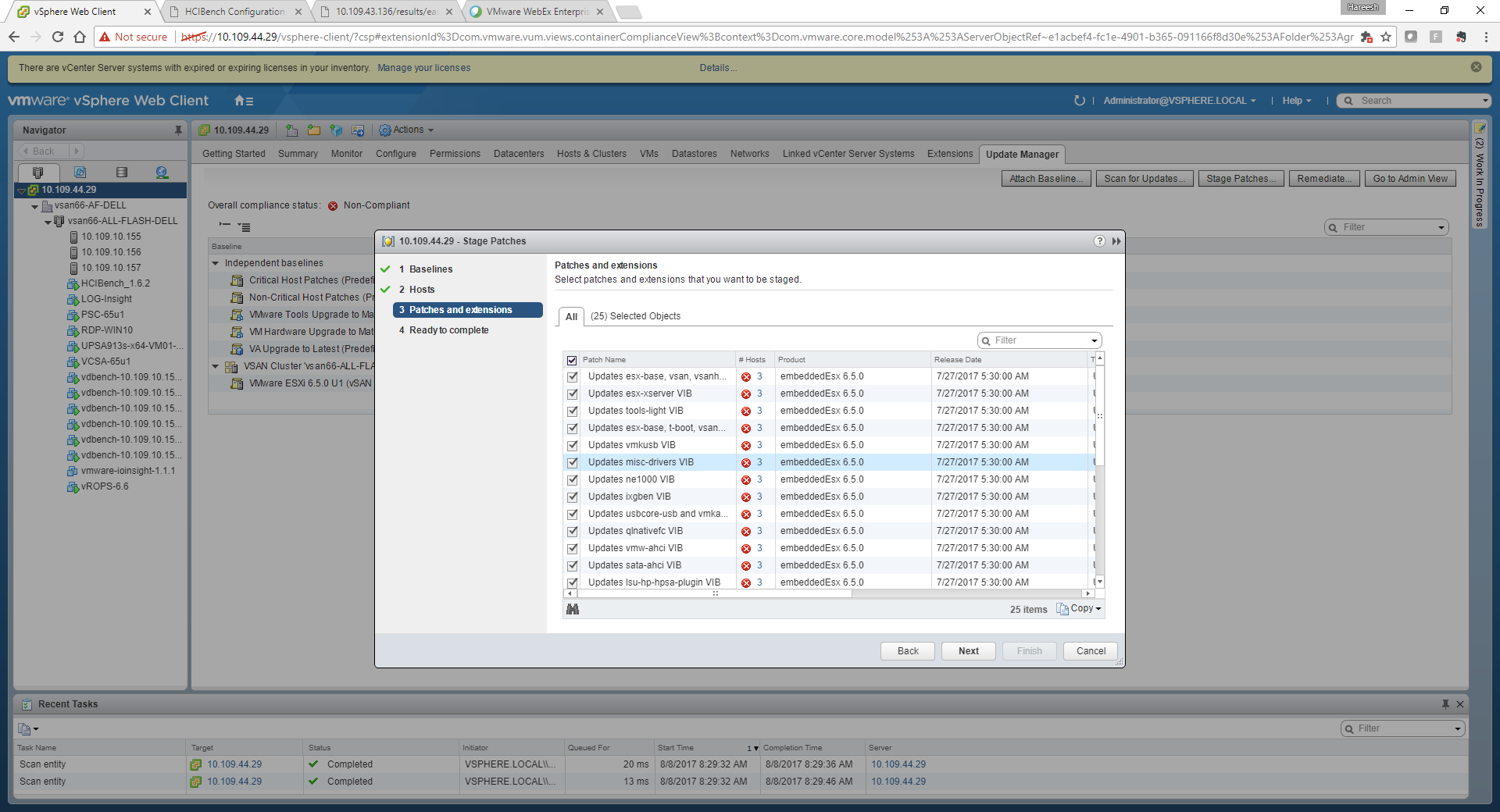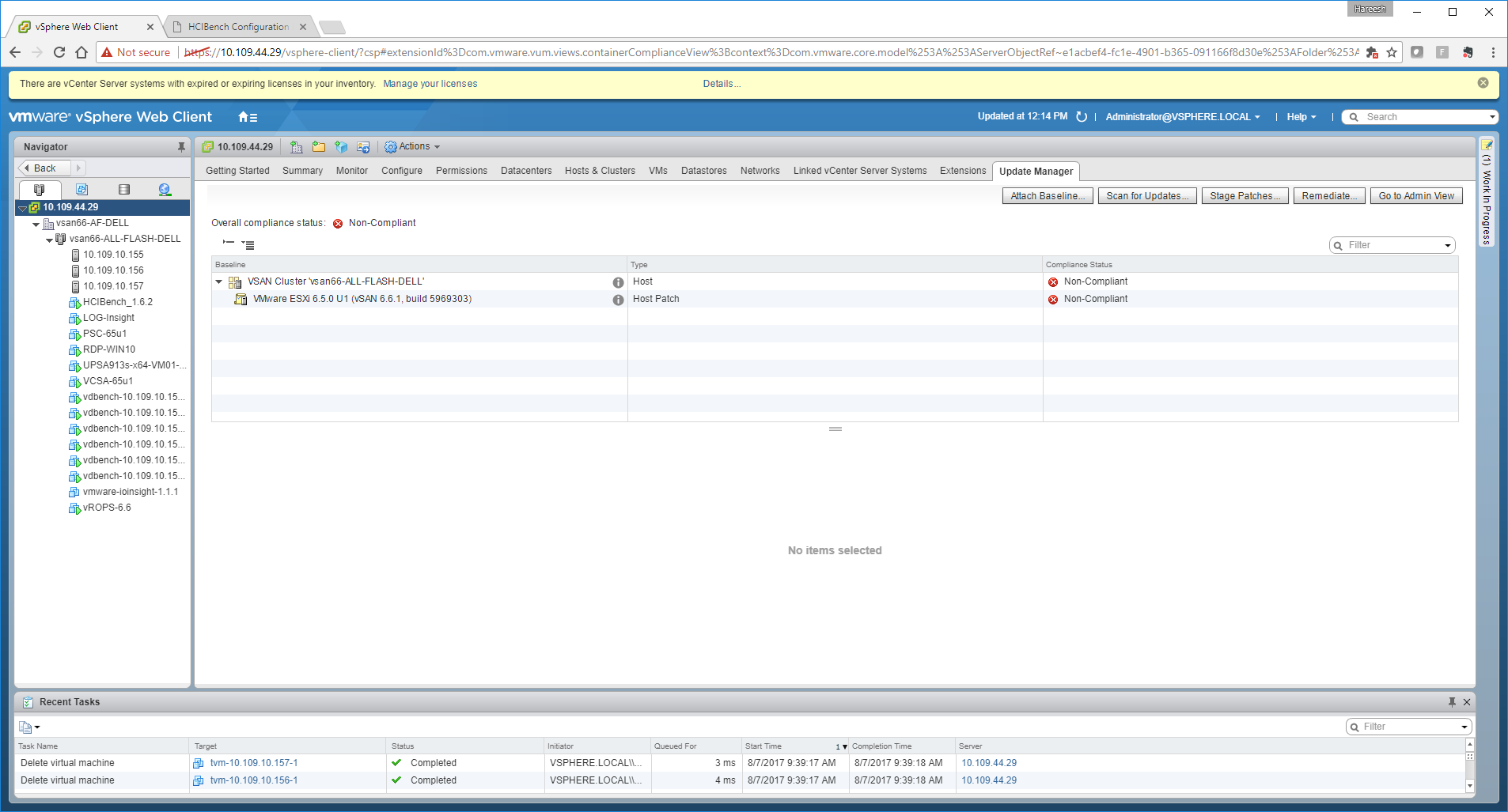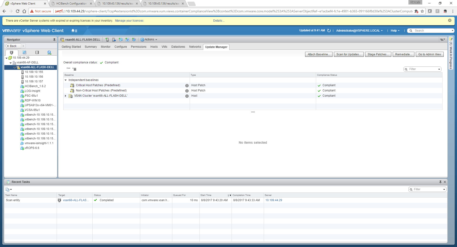 Here you must see that update manager is able to pick up your vSAN enabled clusters available in the vCenter server and also recommends you to have the hosts patched to 6.5 U1 release to make them compliant .
