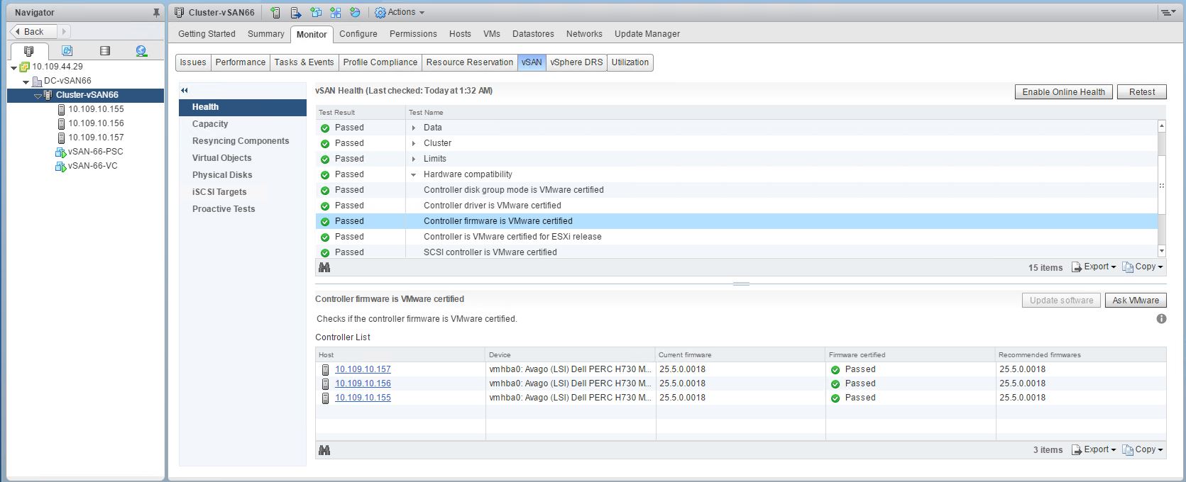 Once all hosts are rebooted one by one you should be able to see the current firmware and recommended firmware match on the Cluster ⇒ Monitor ⇒ vSAN ⇒ Health , all warnings against configuration hardware should be cleared .