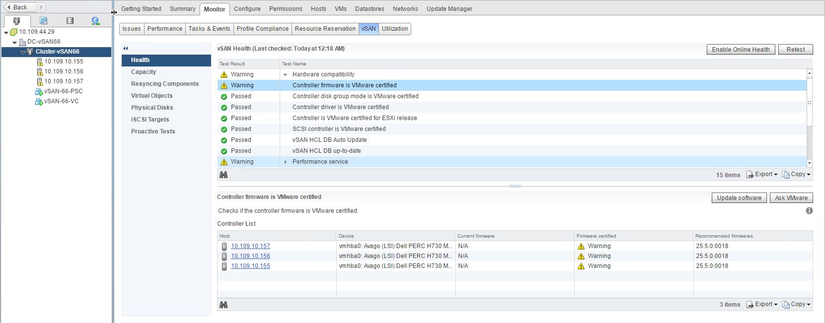 Here is an example , where we see that the Hardware compatibility and performance service are having issues reported . When we expand these we see that the controller firmware is not being pulled properly by vSAN , you will definitely see a warning against vSAN HCL DB up-to-date you will need to update this either with update this by clicking get latest version online if the VC has connectivity to the internet otherwise manually upload it by following article here