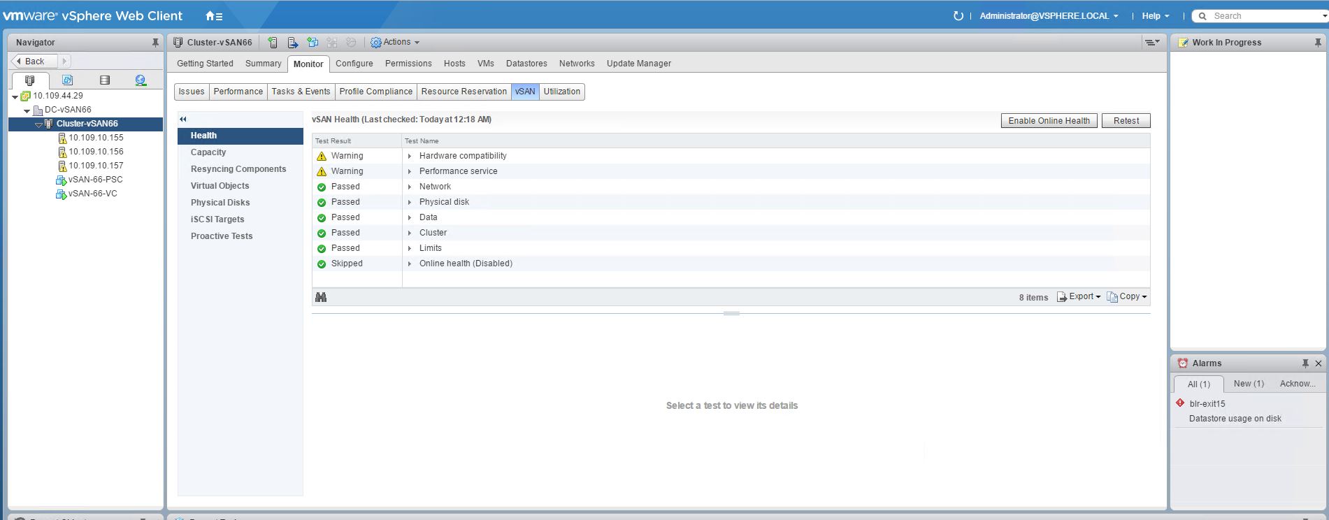 What and How to monitor my vSAN health . First thing is you will need to Navigate to vSAN health service by Navigating from Cluster ⇒ Monitor ⇒ vSAN ⇒ Health . You may or may not see any warning different Metrics test generally run by the vSAN health service , here we have “Hardware Compatibility , Performance Service , Network , Physical disk , Data , Cluster , Limits and Online health” . Warnings thrown under each metrics will further needs to be examined by expanding each of them .