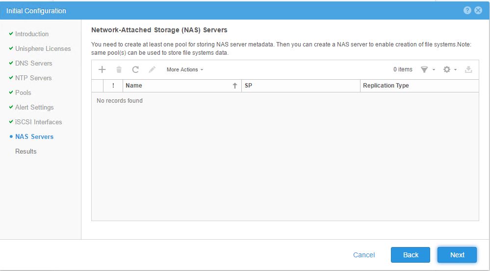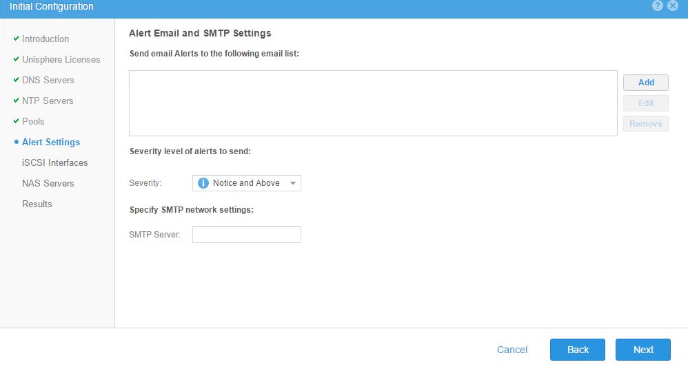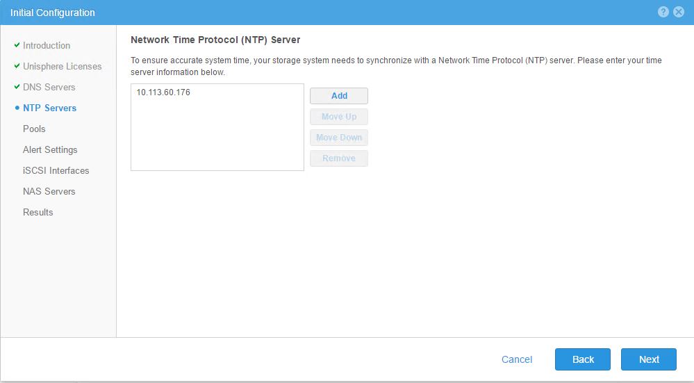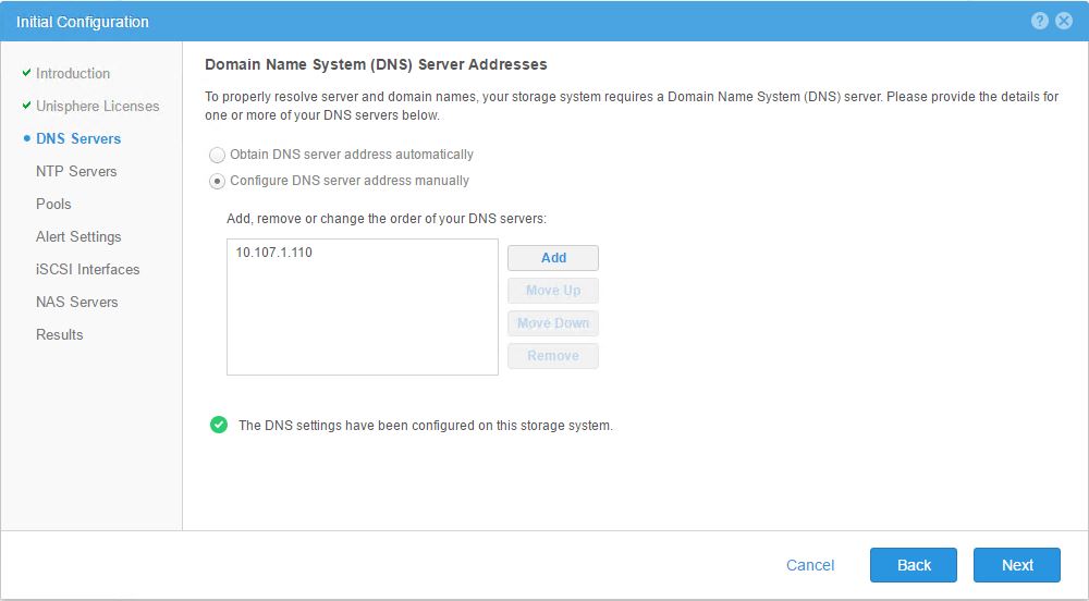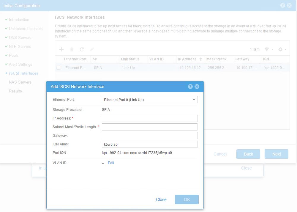 - Proceed with the configuration of your DNS servers , NTP servers . you may skip Pools , Alert Settings ,iSCSI Interface may be configured and be tagged to one of the available ports on the VSA see the example below , you will be later using different up links for your NAS server configuration and other networking requirements for exporting your vSA storage to the hosts .You may skip the NAS server configuration part , this can be done later . You would have now completed the initial configuration for UnityVSA .
