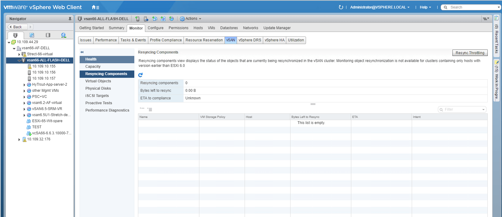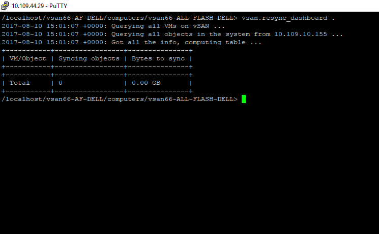 Select : Cluster ⇒ Monitor ⇒ vsan ⇒ Resyncing Components or use RVC command : ” vsan.resync_dashboard .” (see how-to-login to RVC) under cluster directory . If there is an ongoing resync , DONOT attempt maintenance on any of the other hosts , wait for the resync to complete . If there were no resync operations seen , proceed to perform same steps with all other hosts by placing them in maintenance remove the vib and rebooting them one at time .